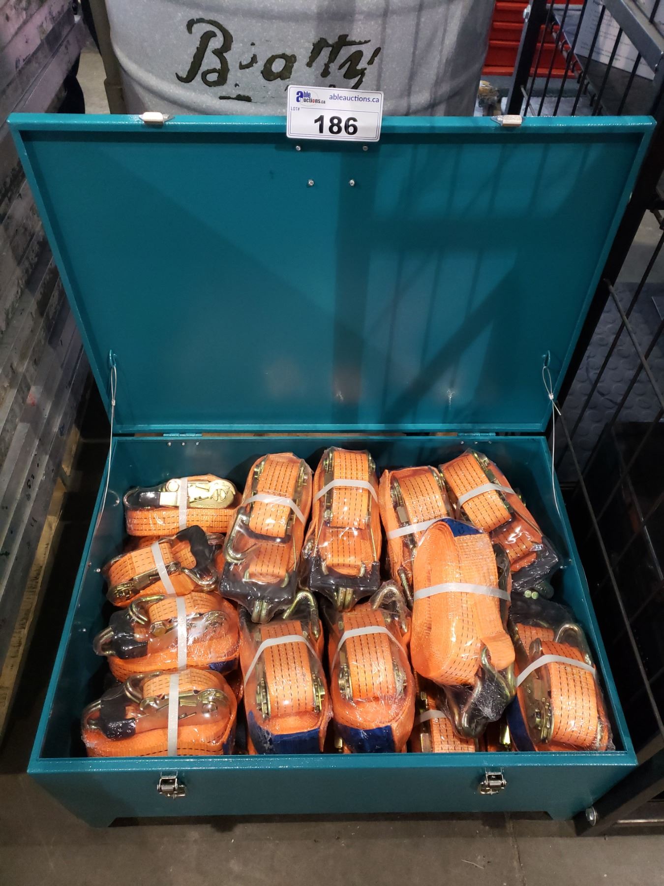 GREATBEAR BOX OF RATCHET TIE DOWNS & BLUE RUBBER HOSE