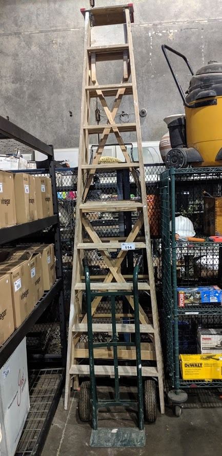 GREEN 2-WHEEL DOLLY AND PAIR OF WOOD STEP LADDERS