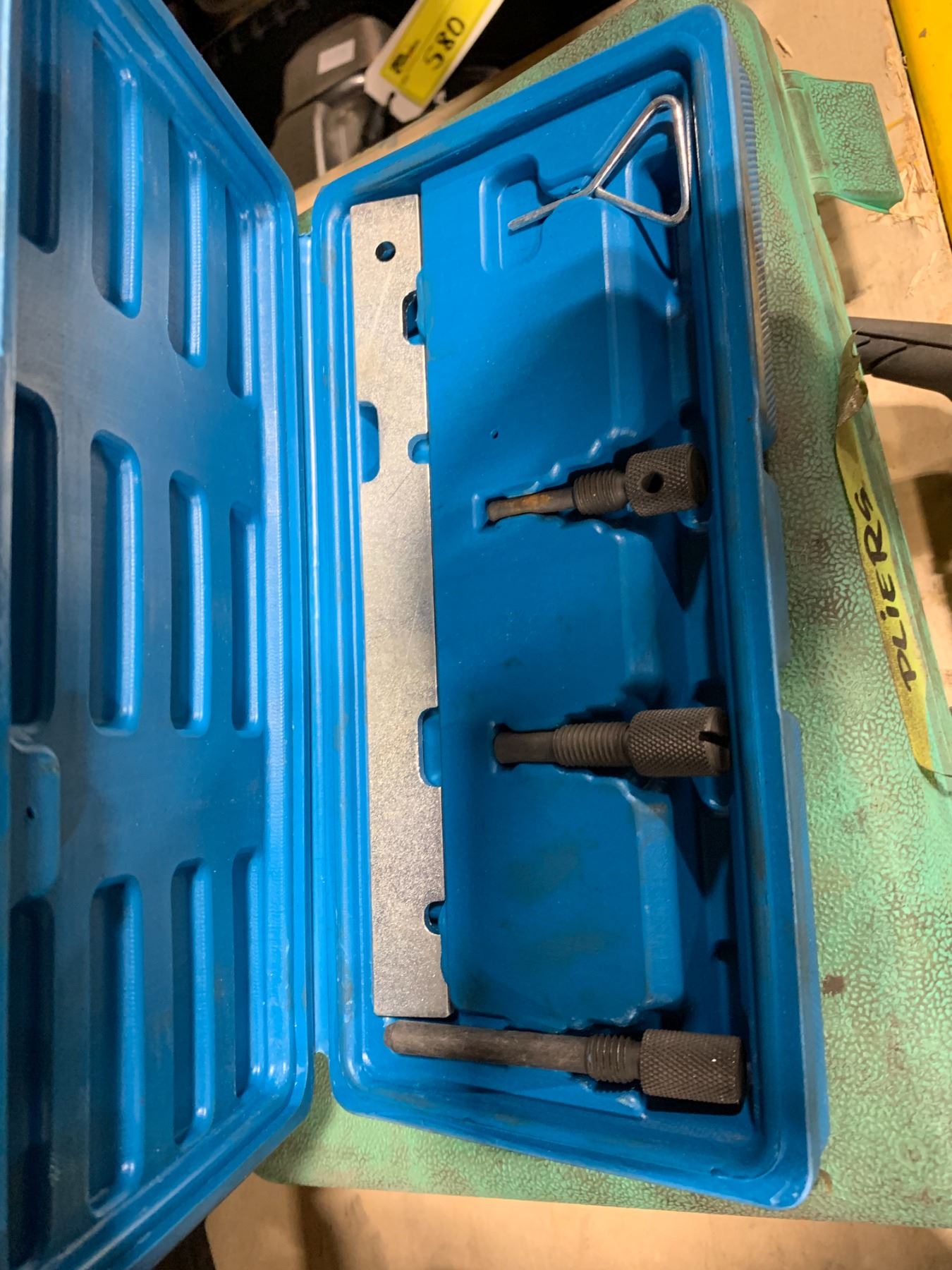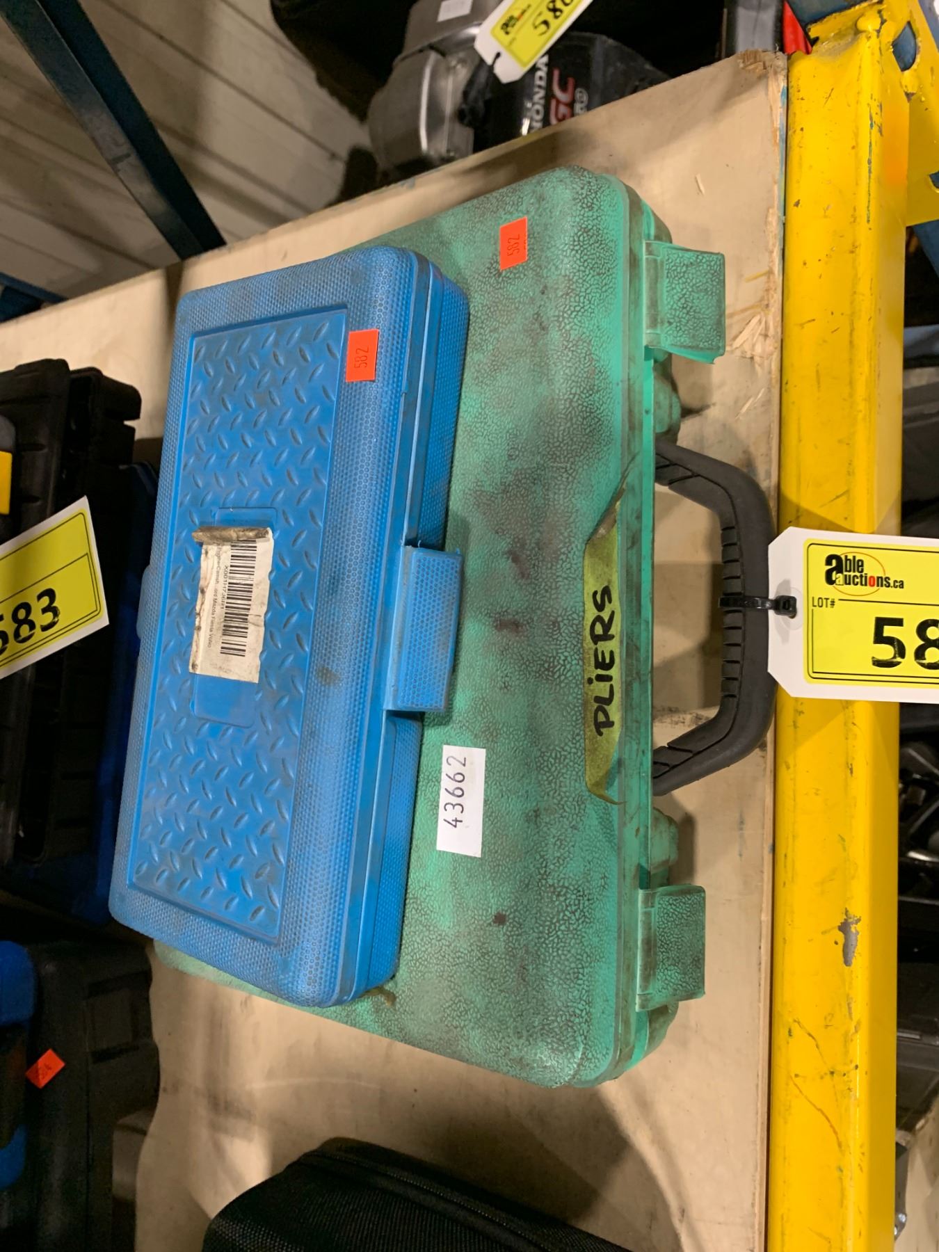 GREEN BOX OF ASSORTED PLIERS & 8MILELAKE ENGINE CAMSHAFT IN HARD TRANSPORT CASE