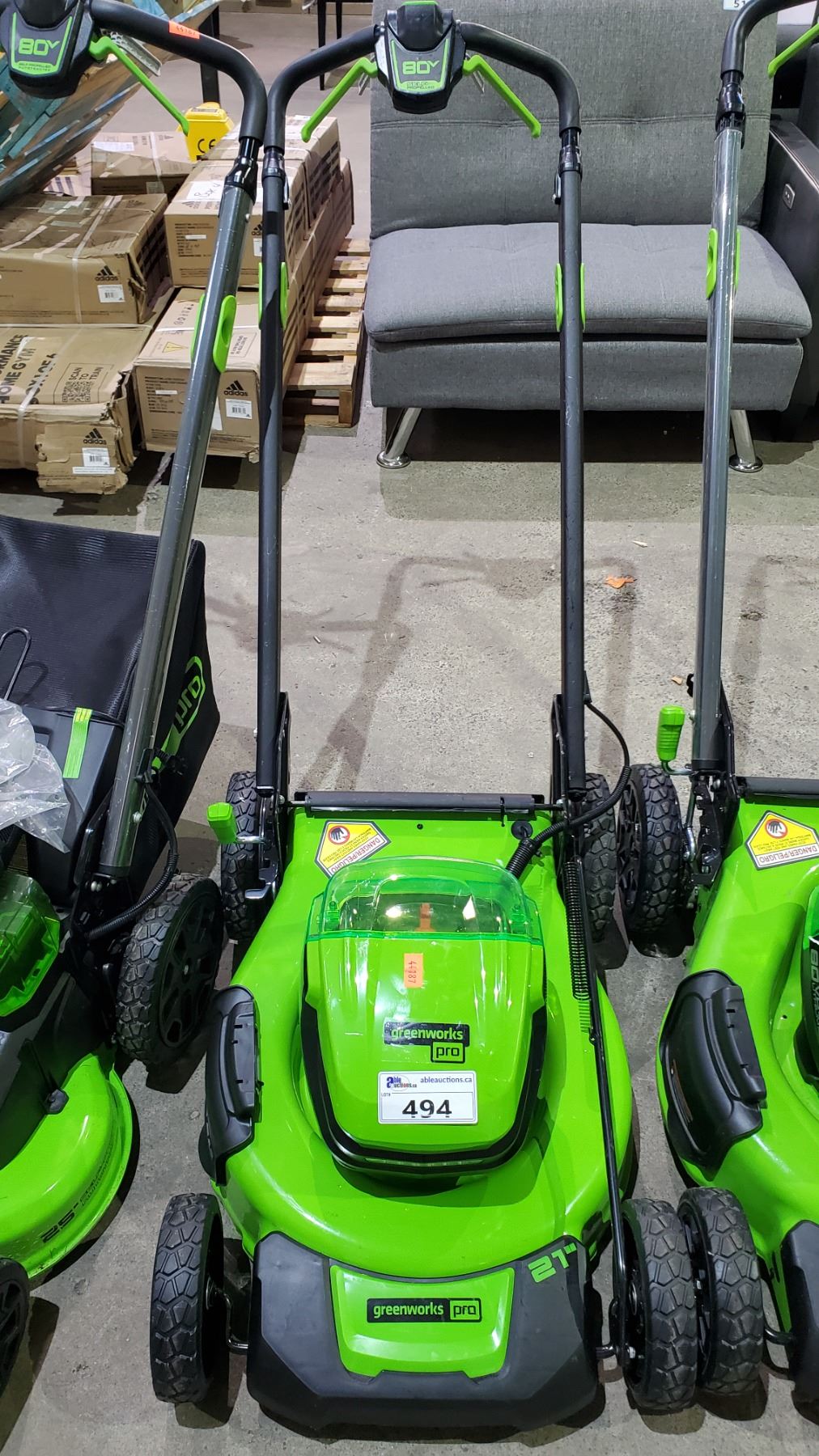 GREENWORKS PRO 21" 80V CORDLESS SELF PROPELLED LAWN MOWER (UNKNOWN WORKING CONDITION, NO BATTERIES, NO REAR BAG)