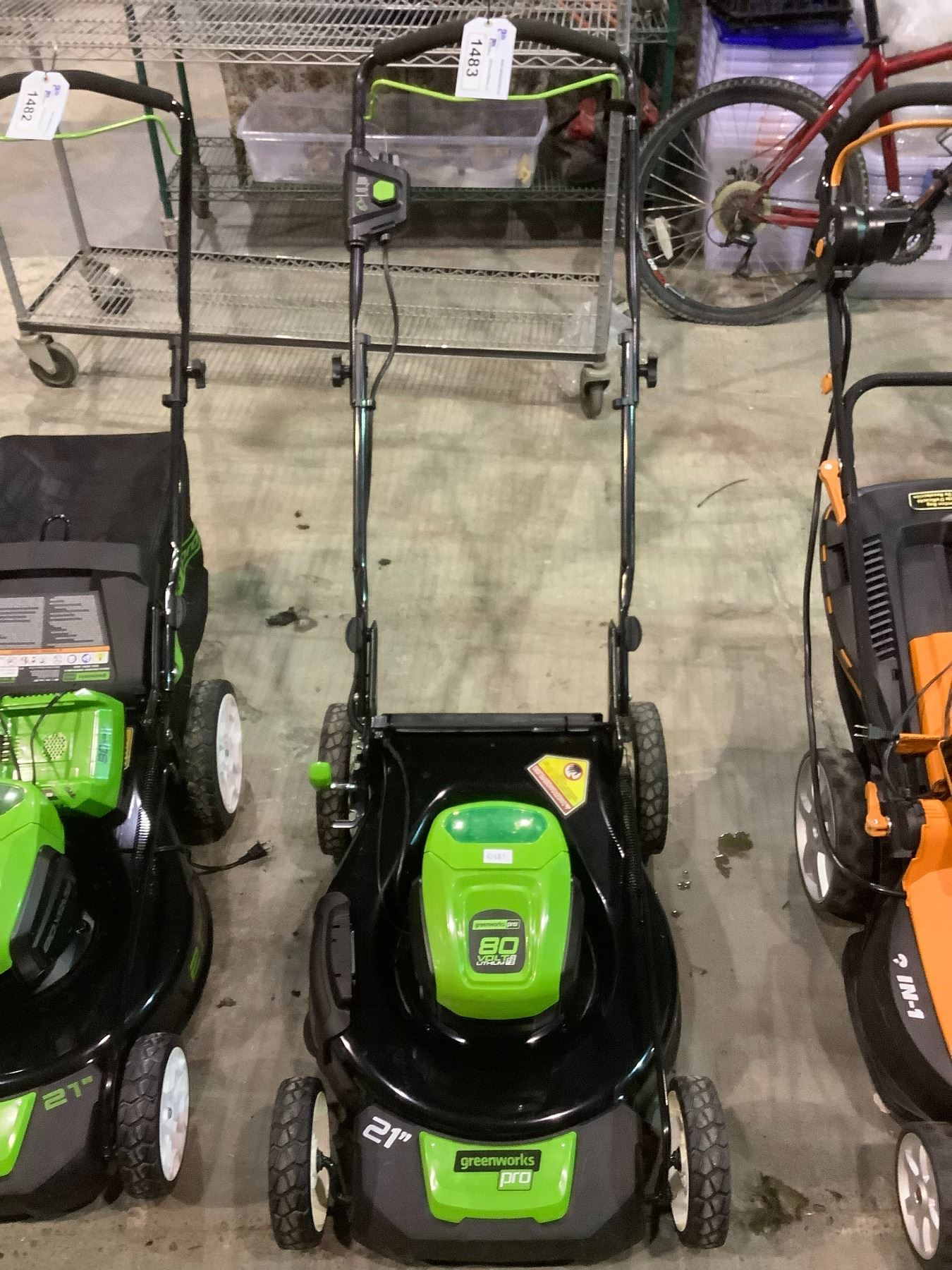 GREENWORKS PRO 21" RECHARGEABLE BRUSHLESS LAWNMOWER (NO CHARGER OR REAR BAG, WORKING CONDITION UNKNOWN)