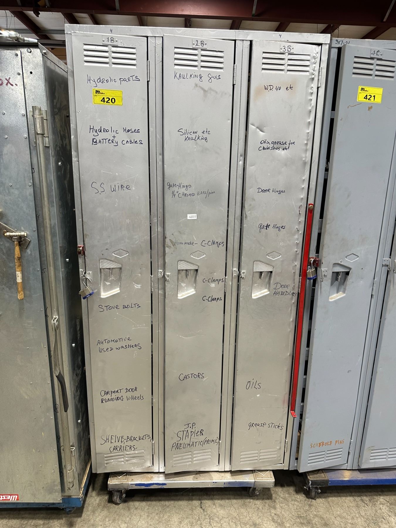GREY 36"W X 15"D X 78"H METAL LOCKING 3 BAY STORAGE LOCKER ON MOBILE CART WITH ASSORTED CONTENTS OF HOSES, BATTERY CABLES, SILICON, OILS / GREASES & HARDWARE