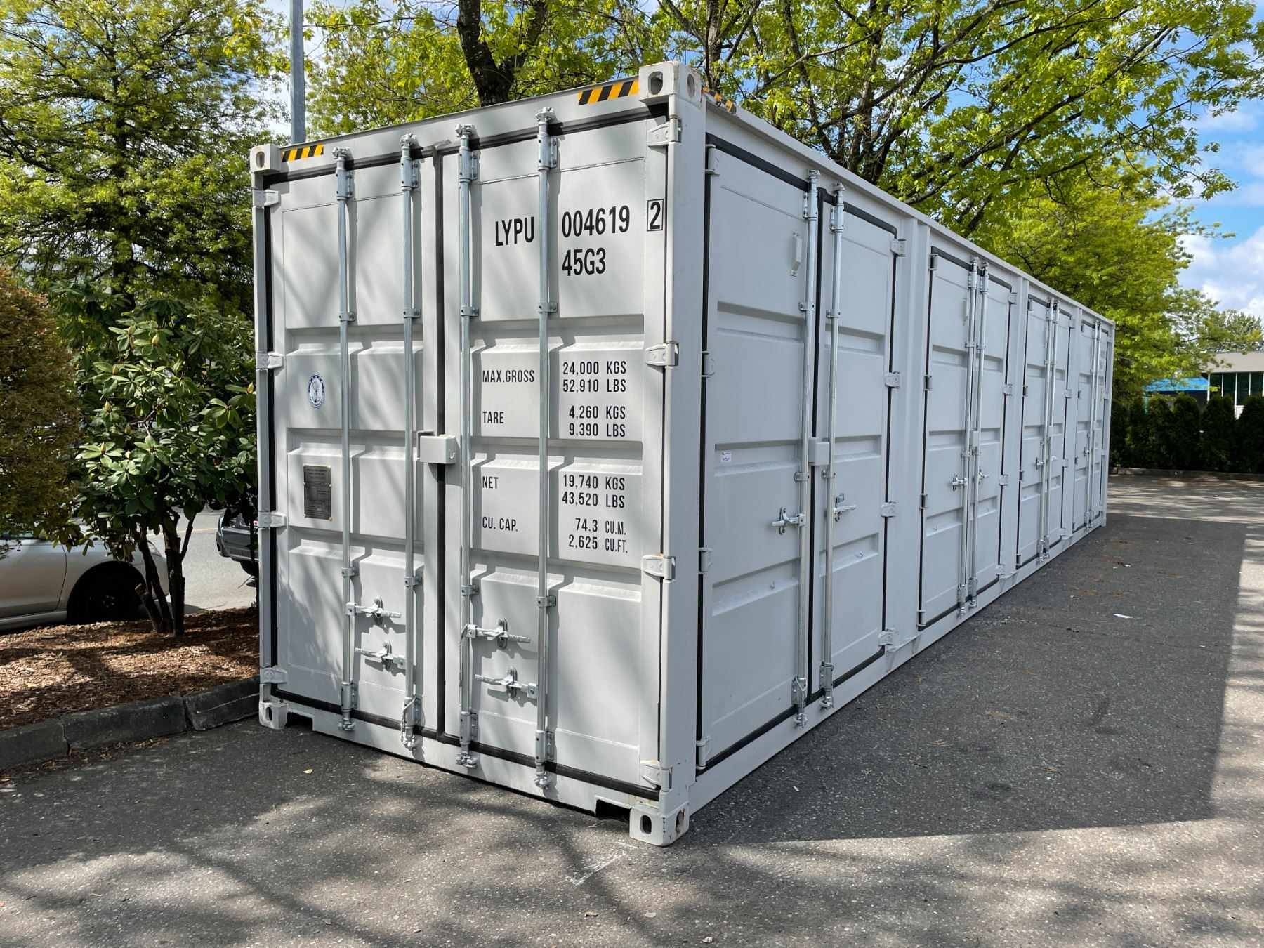 GREY 40' 52,910 MAX CAPACITY INDUSTRIAL TRANSPORT CONTAINER WITH 4 DUAL SWING SIDE DOORS, 1 REAR DUAL SWING REAR DOOR WITH CAM LOCKS 40'L X 96"W X 114"H