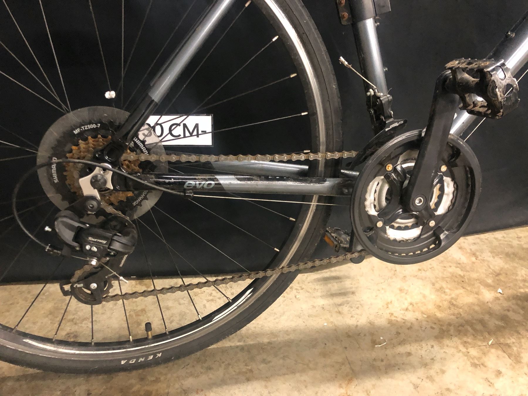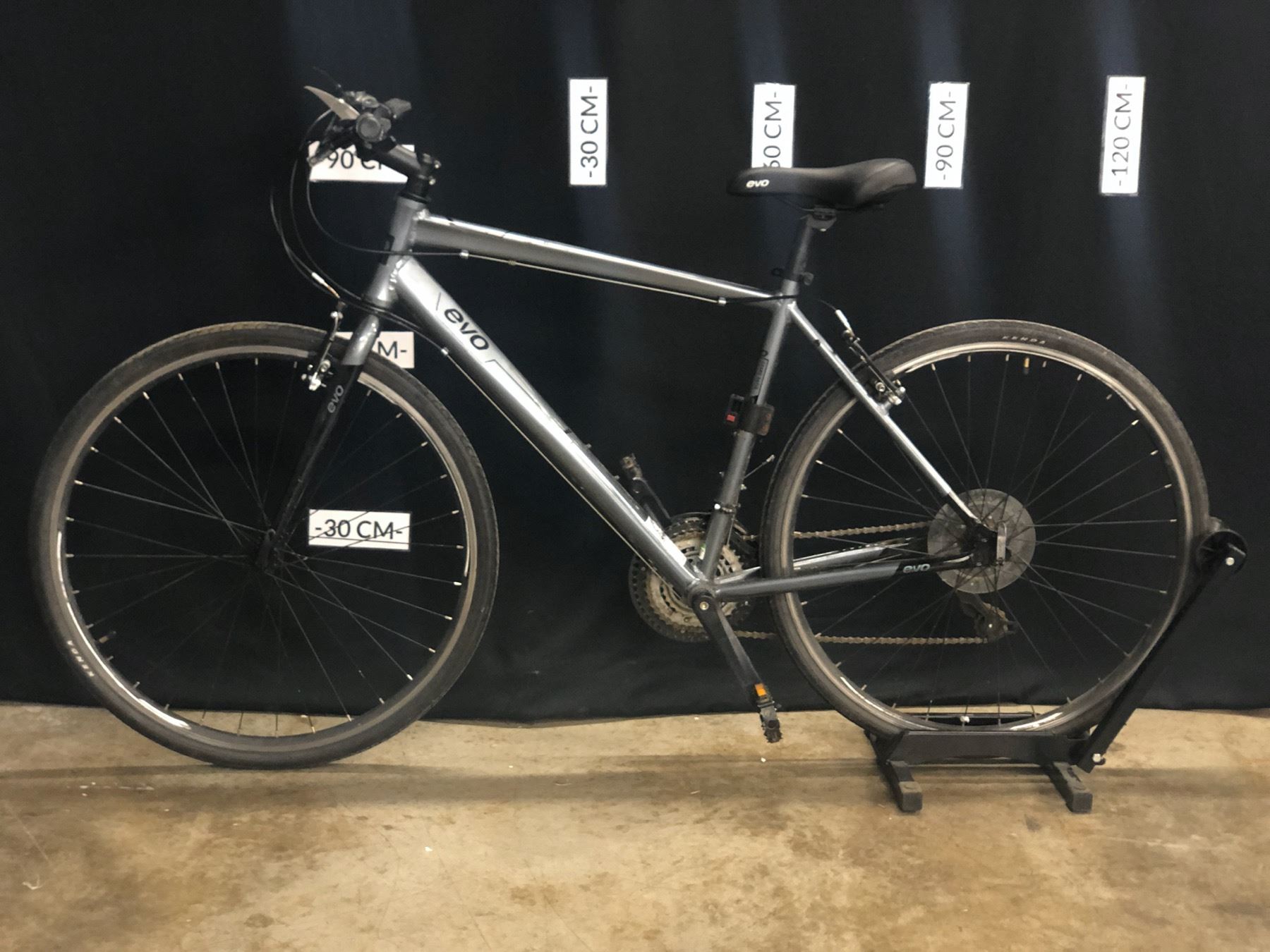 GREY EVO GRAND RAPID 21 SPEED HYBRID TRAIL BIKE, LARGE/20" FRAME SIZE, MINOR BEND IN FRONT RIM CAUSING BRAKE RUBBING, STANDOVER HEIGHT: 82 CM