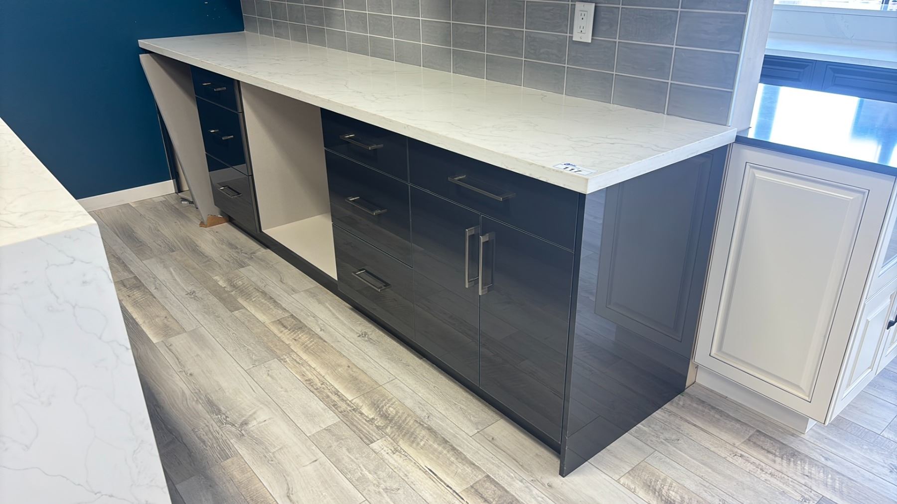 GREY FINISH WITH WHITE STONE COUNTER TOP 2 PCS. KITCHEN CABINET SET APPROX. 110" ACROSS X 36" WIDE X 36" HIGH AND 128" ACROSS X 25" WIDE X 36" HIGH CABINETS WILL NEED TO BE REMOVED FROM THE WALL BY THE SUCCESSFUL BIDDER - PLEASE BRING TOOLS, MANPOWER