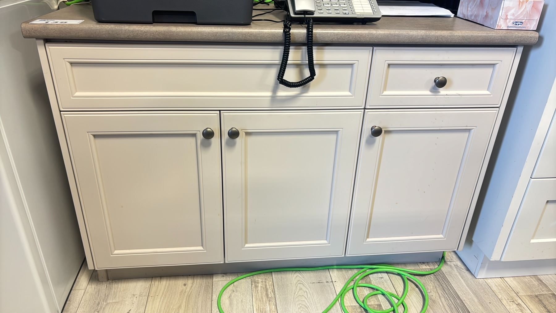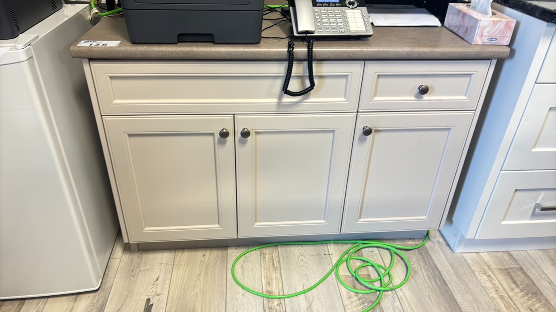 GREY LAMINATE TOP 1 DRAWER 3 DOOR CABINET - 48"W X 23"D X 32"H *CONTENTS NOT INCLUDED* CABINETS WILL NEED TO BE REMOVED FROM THE WALL BY THE SUCCESSFUL BIDDER - PLEASE BRING TOOLS, MANPOWER