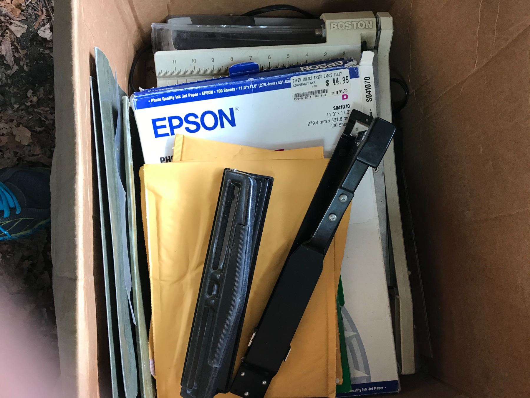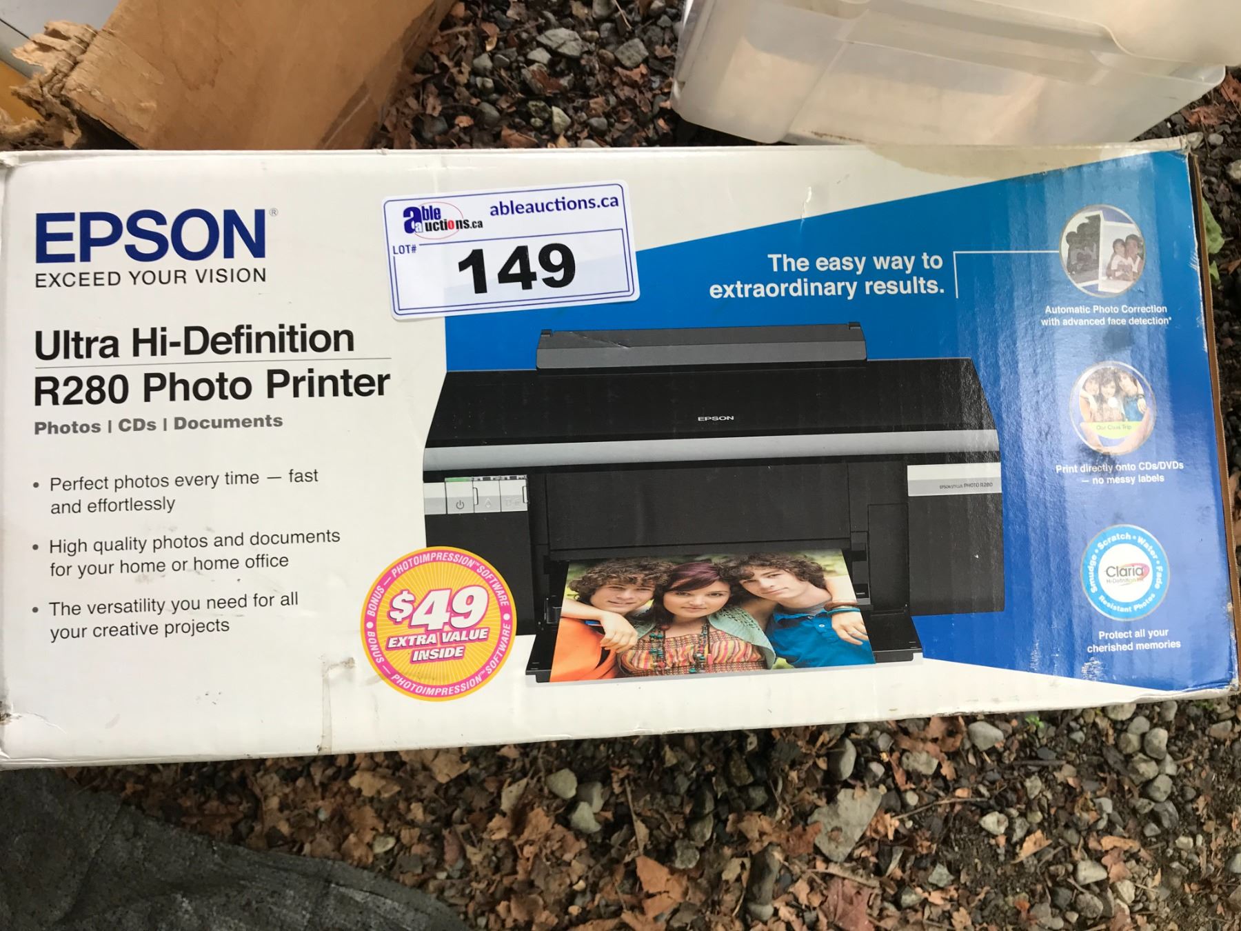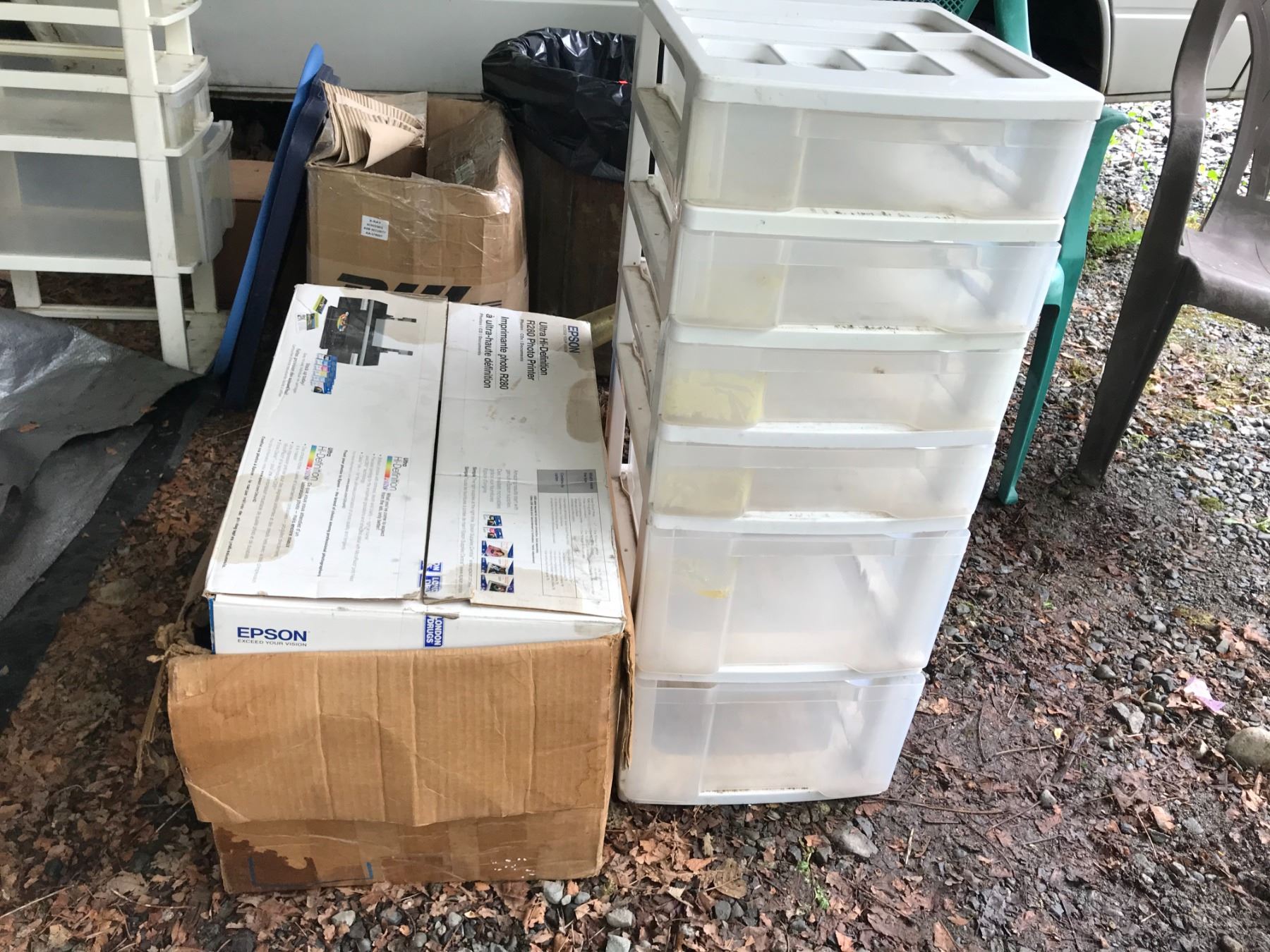 GROUP LOT - EPSON R280 PRINTER, DVD PLAYER, MISC OFFICE EQUIPMENT & PLASTIC TOTES *NANAIMO*