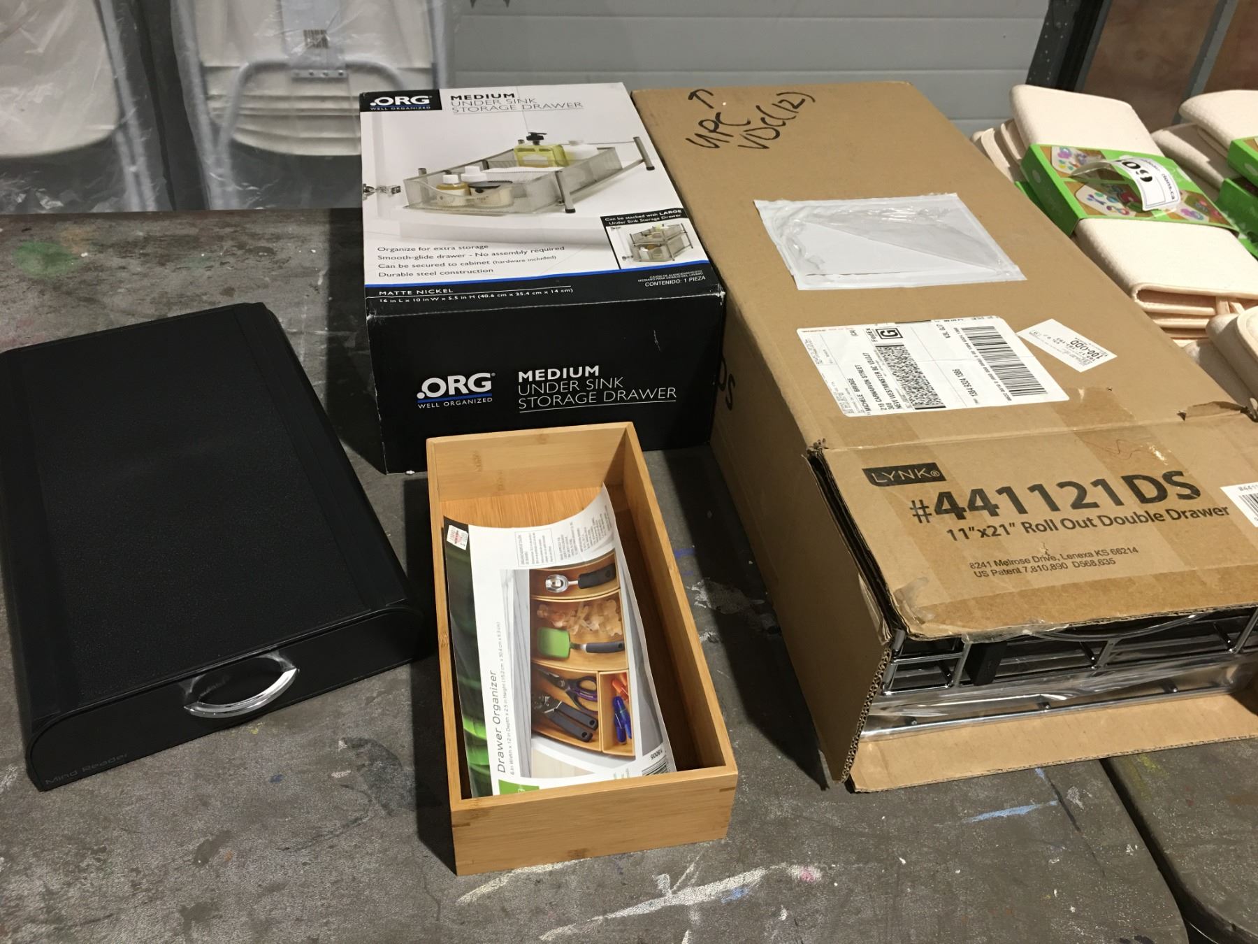 GROUP LOT OF ASSTD KITCHEN TRAYS (UNDER SINK STORAGE DRAWER/DRAWER ORGANIZER/NESTING TRAY/11" X 21" ROLL OUT DOUBLE DRAWERS