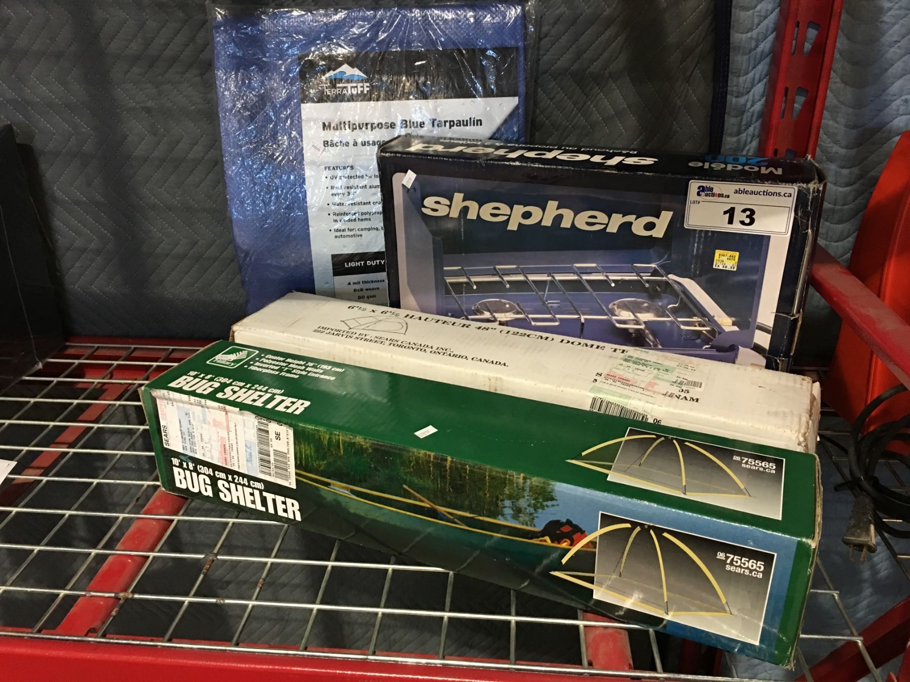 GROUP OF 4 OUTDOOR CAMPING ITEMS - SHEPHERD PROPANE STOVE/SMALL DOME TENT/BUG SHELTER & TARP