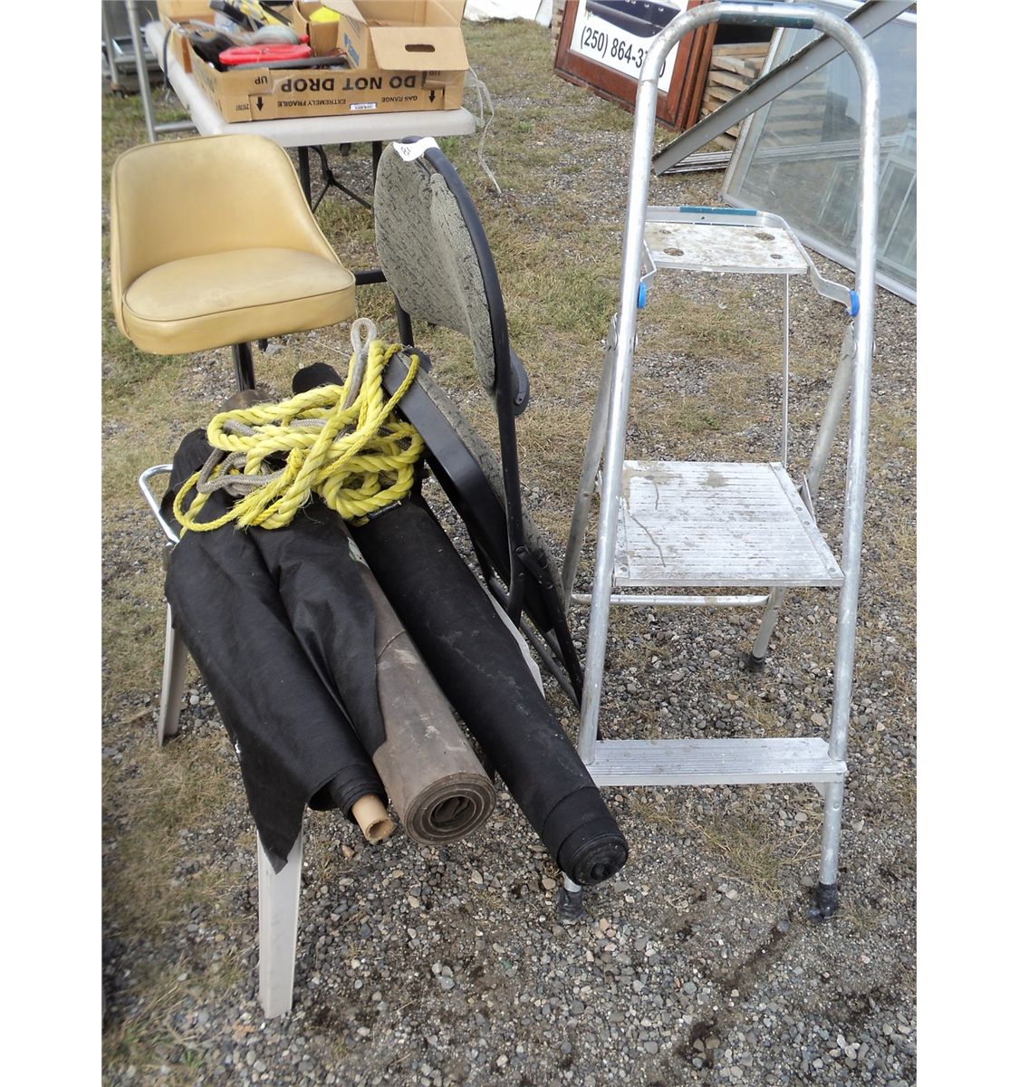 Garden cloth, tar paper, chrome & vinyl bar stool, rope, folding chair, step ladder, plastic table