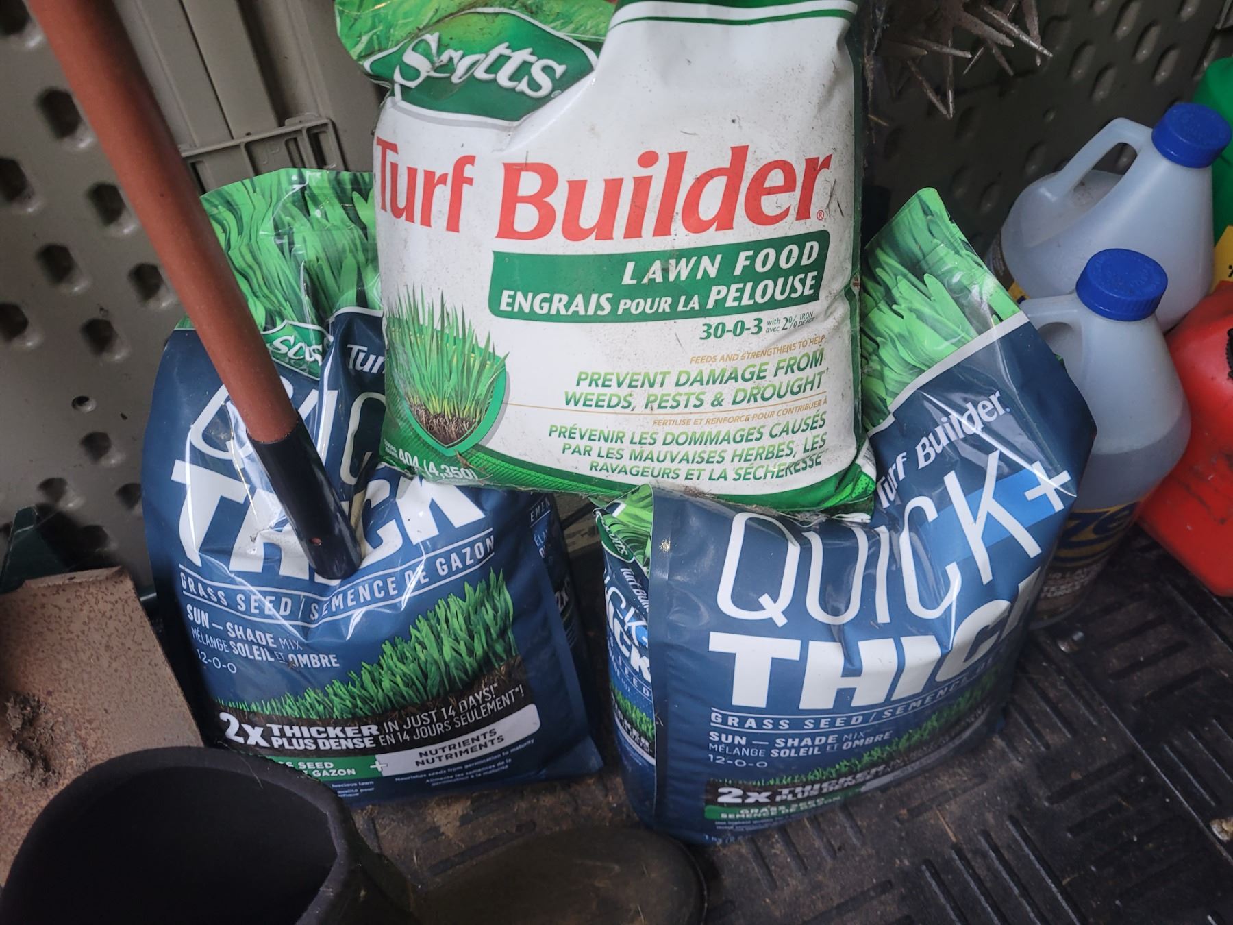 Scotts Turf Builder, Miracle Shake n Feed, Seeds , Zep, gardening spades, rakes, edger. Pickup at 10 am