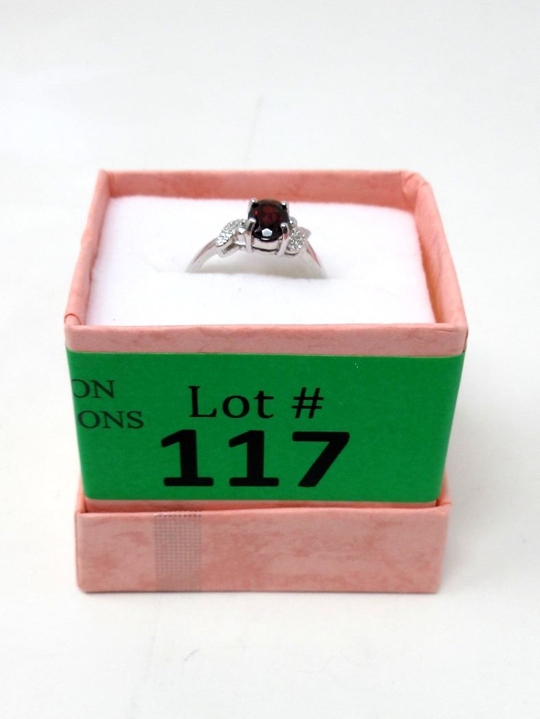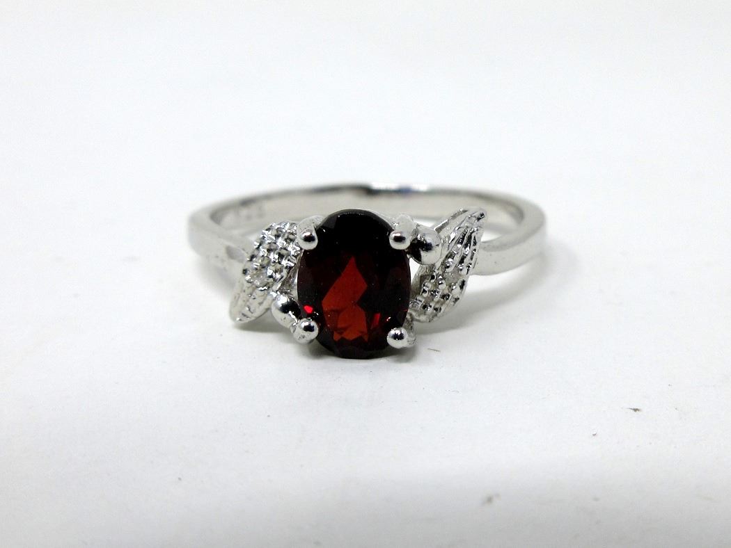 Oval cut garnet with 2 side diamonds. Retail value $310.