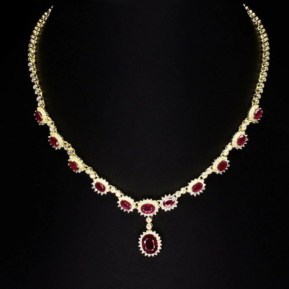 925 STERLING SILVER;PLATE....14K YELLOW GOLD;LENGTH ....(INCHES)16.5MAIN STONERUBY;OTHER GEMSCUBIC ZIRCONIA;TOTAL WEIGHT160.01 CT (TOTAL WEIGHT OF SILVER + STONE)DIMENSION* STONE 6.0 X 4.0 TO 10.0 X 8.0 MM. * CZ 1.5 TO 2.0 MM. * STONES PART LENGTH MM.;MAIN STONE SHAPEOVAL CUT;MAIN STONE COLORTOP RICH RED PINK;CLARITY/GRADETRANSPARENT;LUSTERPRECIOUS;TREATMENT- Yes;ORIGINMOZAMBIQUE;HARDNESS9;