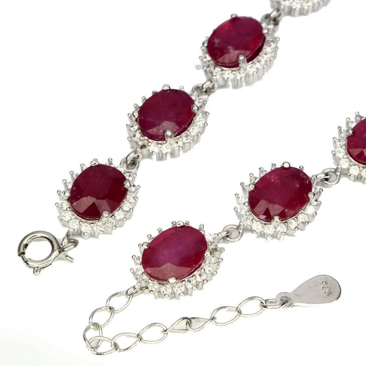 925 STERLING SILVER;PLATE-14K WHITE GOLD;LENGTH -(INCHES)8.5;MAIN STONE-RUBY;OTHER GEMS-CUBIC ZIRCONIA;TOTAL WEIGHT-84.68 CT (TOTAL WEIGHT OF SILVER + STONE)DIMENSION* STONE 8.0 X 6.0 MM. * CZ 1.0 MM. * FACE BRACELET 180.0 X 9.0 MM.MAIN STONE SHAPE-OVAL CUT;MAIN STONE COLOR-TOP BLOOD RED;TREATMENT- yes;ORIGIN-MADAGASCAR;HARDNESS-9;