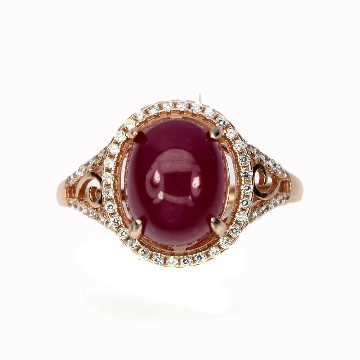 925 STERLING SILVER;PLATE....14K ROSE GOLD;RING SIZE...8.5(resizeable)MAIN STONE-RUBY;OTHER GEMS-CUBIC ZIRCONIA;TOTAL WEIGHT-20.14 CT (TOTAL WEIGHT OF SILVER + STONE)DIMENSION* STONE 11.0 X 9.0 MM. * CZ 1.0 TO 2.0 MM. * RING 8.5 SIZE * FACE RING 19.0 X 18.0 MM.;MAIN STONE SHAPE-OVAL CABOCHON;MAIN STONE COLOR-TOP RICH RED;CLARITY/GRADE-TRANSPARENT;LUSTER-CHARMING;TREATMENT-HEATED;ORIGIN-MADAGASCAR;HARDNESS-9