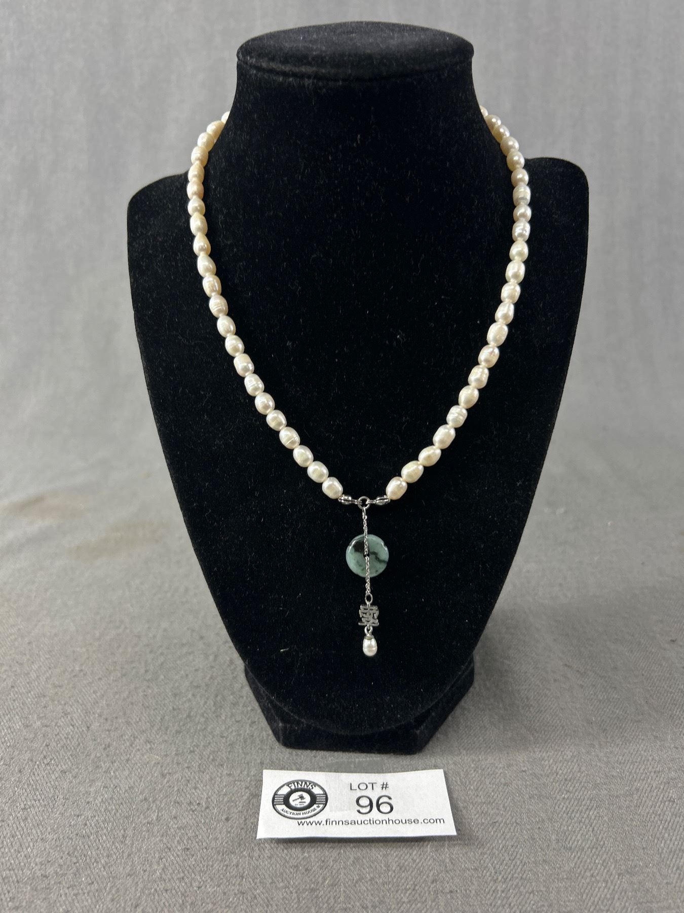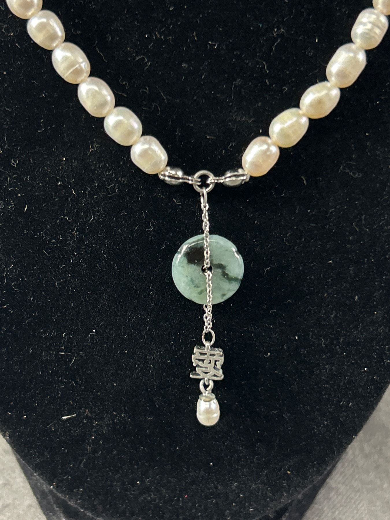Genuine Pearl Necklace 925 Sterling Findings & 925 Jade & Lucky Symbol Pendant - 14" + 3.5" Extender - Tested