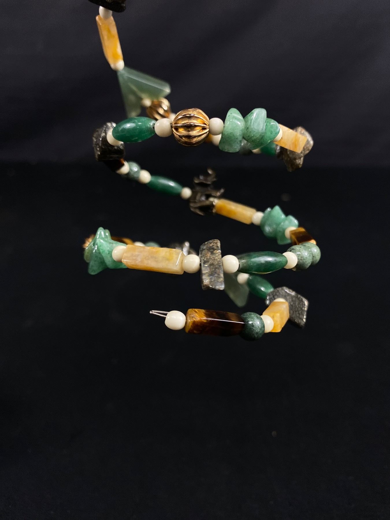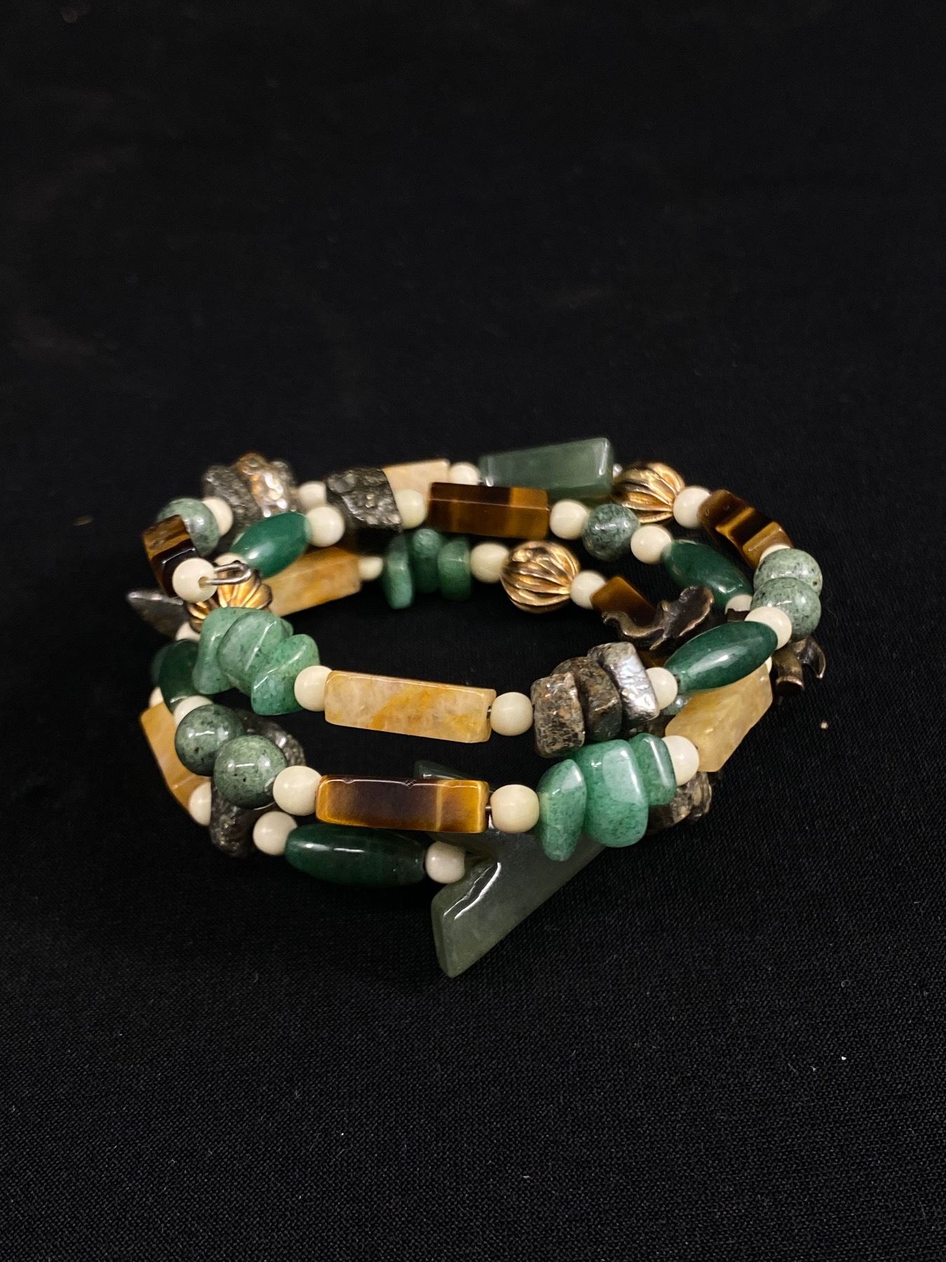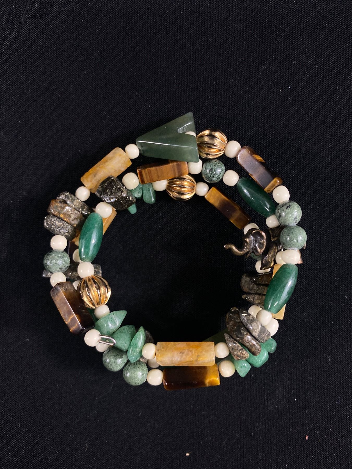 Genuine Semi Precious Stones & Beads Wire Bracelet w/Silver Elephants