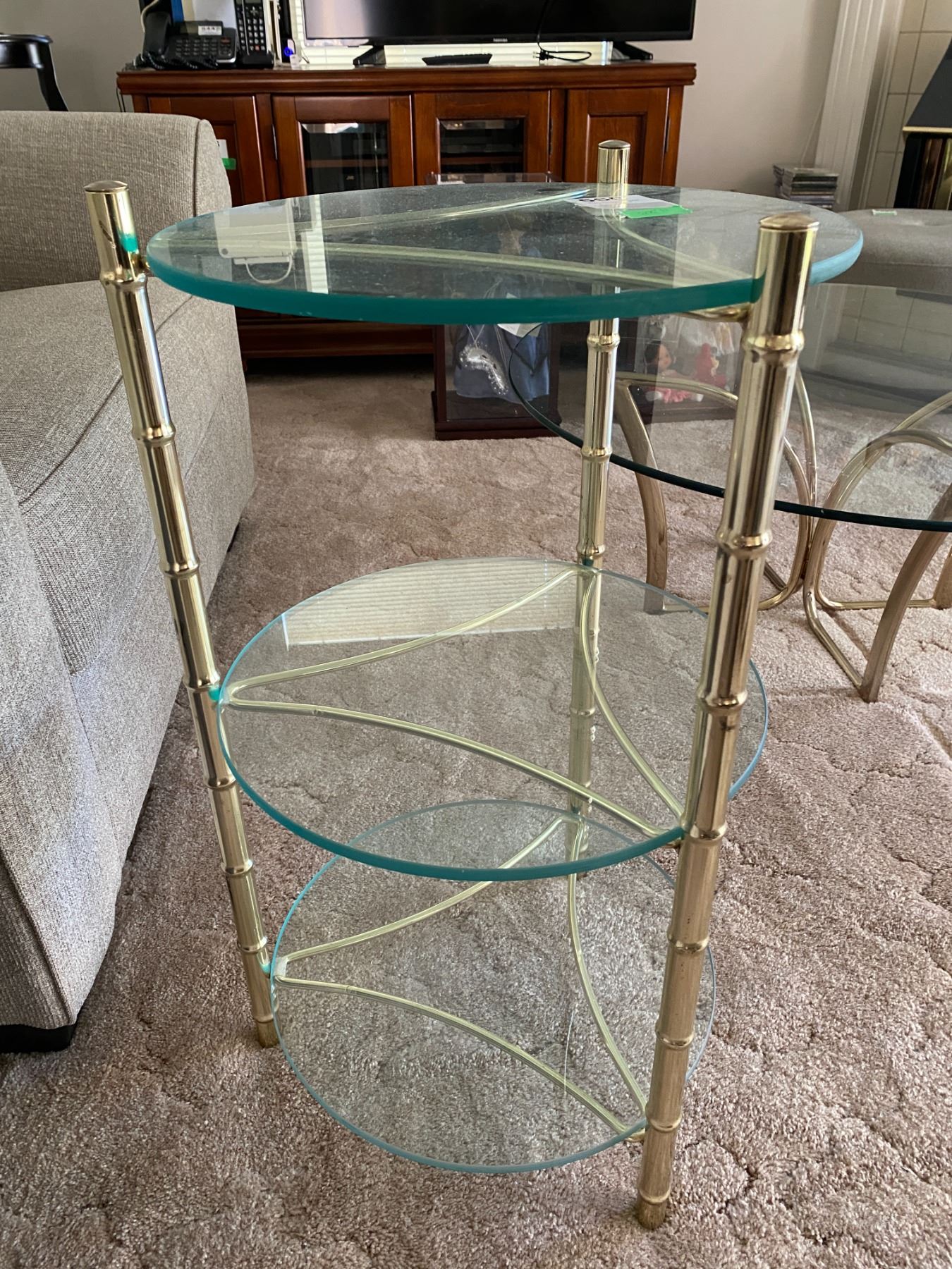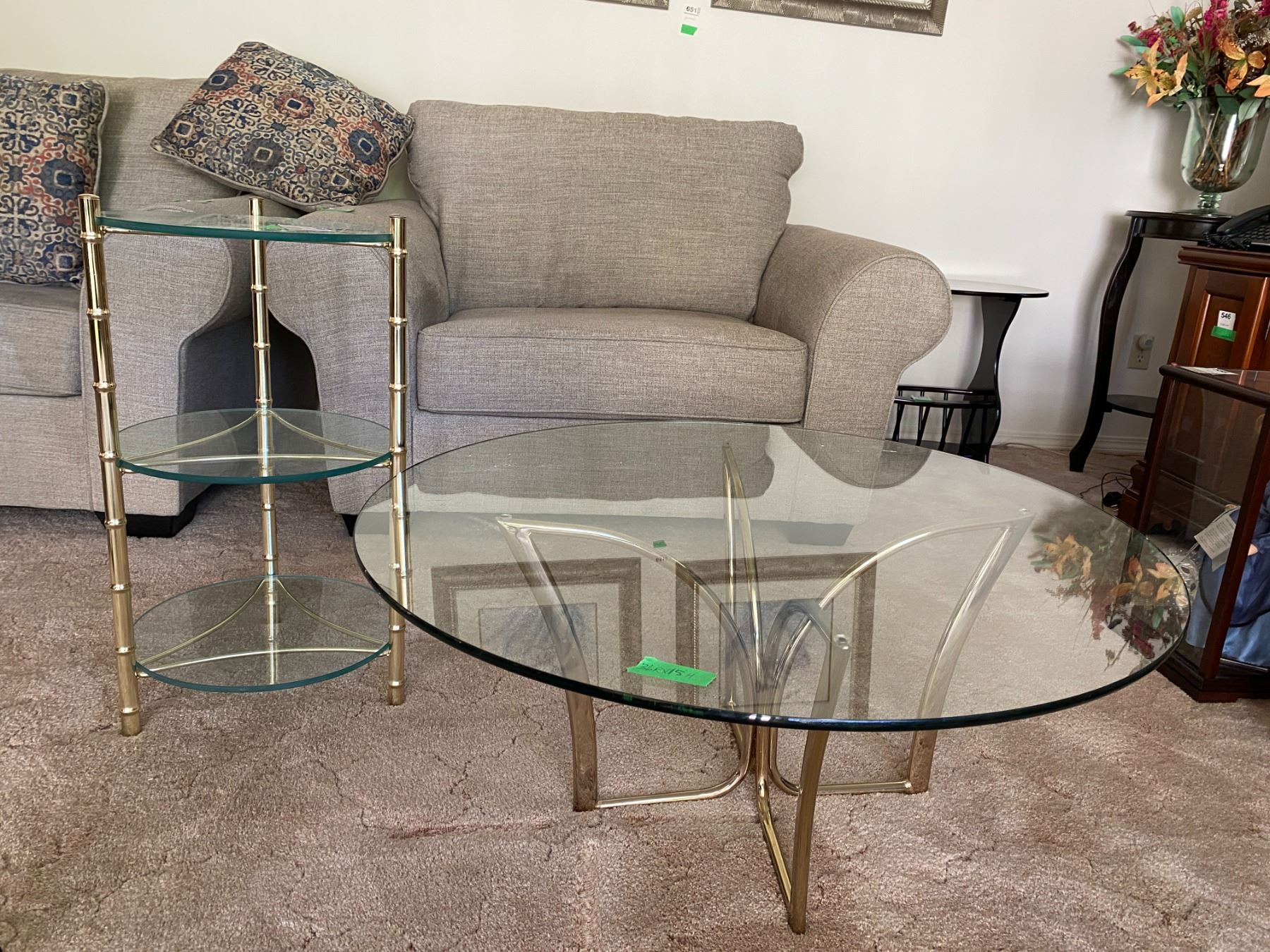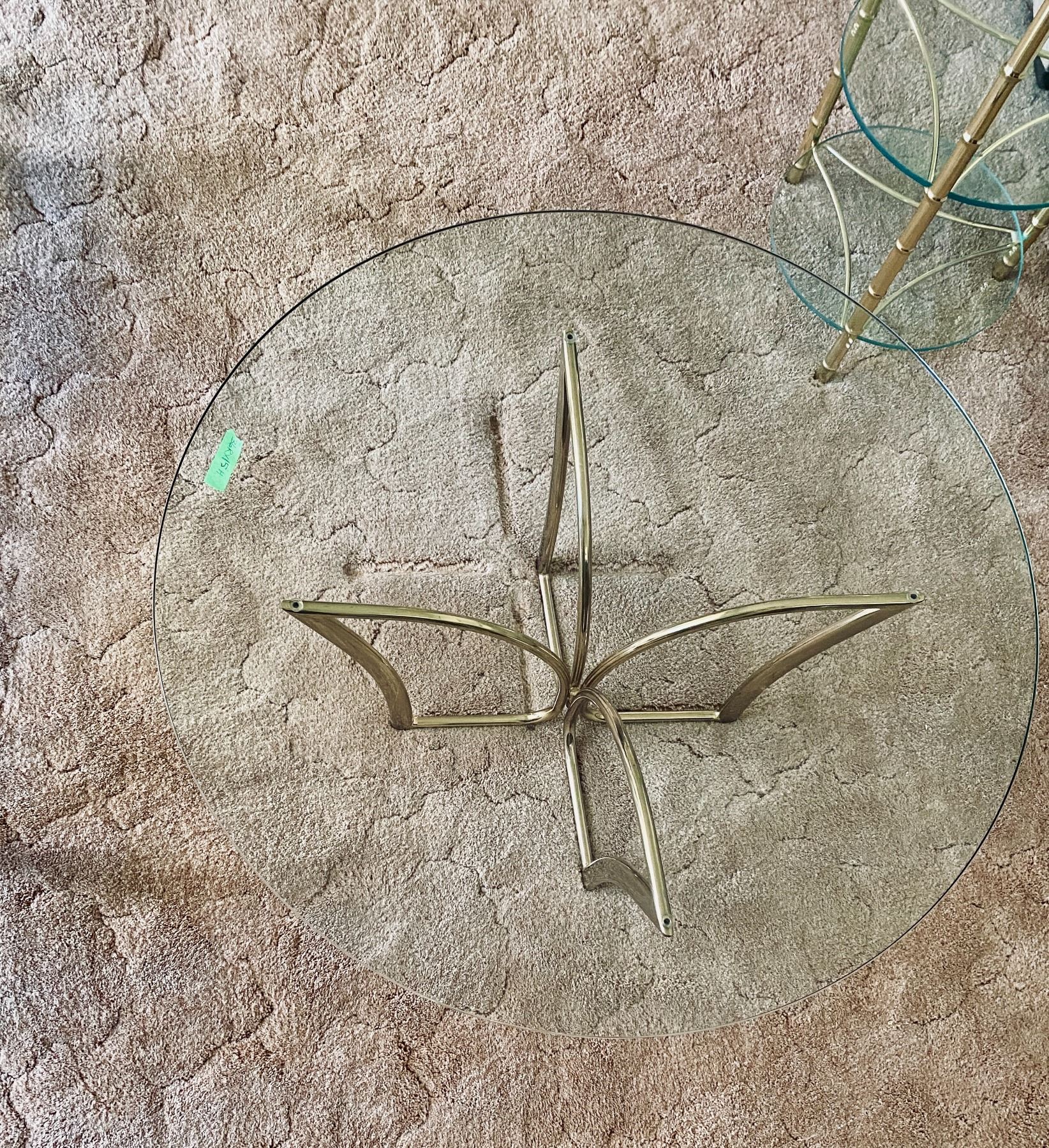 Glass and brass-tone table and stand. Coffee table is 36" diameter x 15"H. Stand is 28"H.