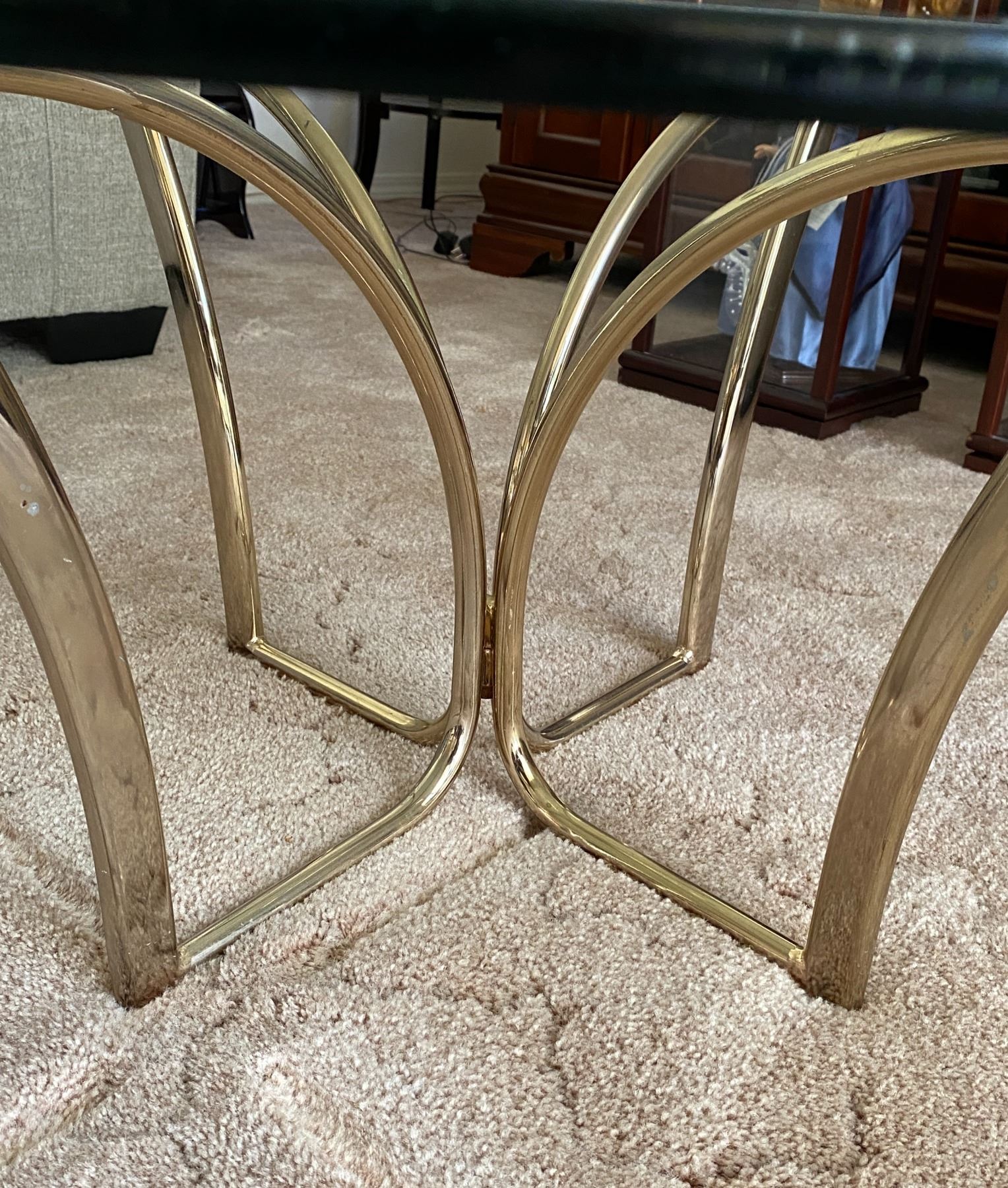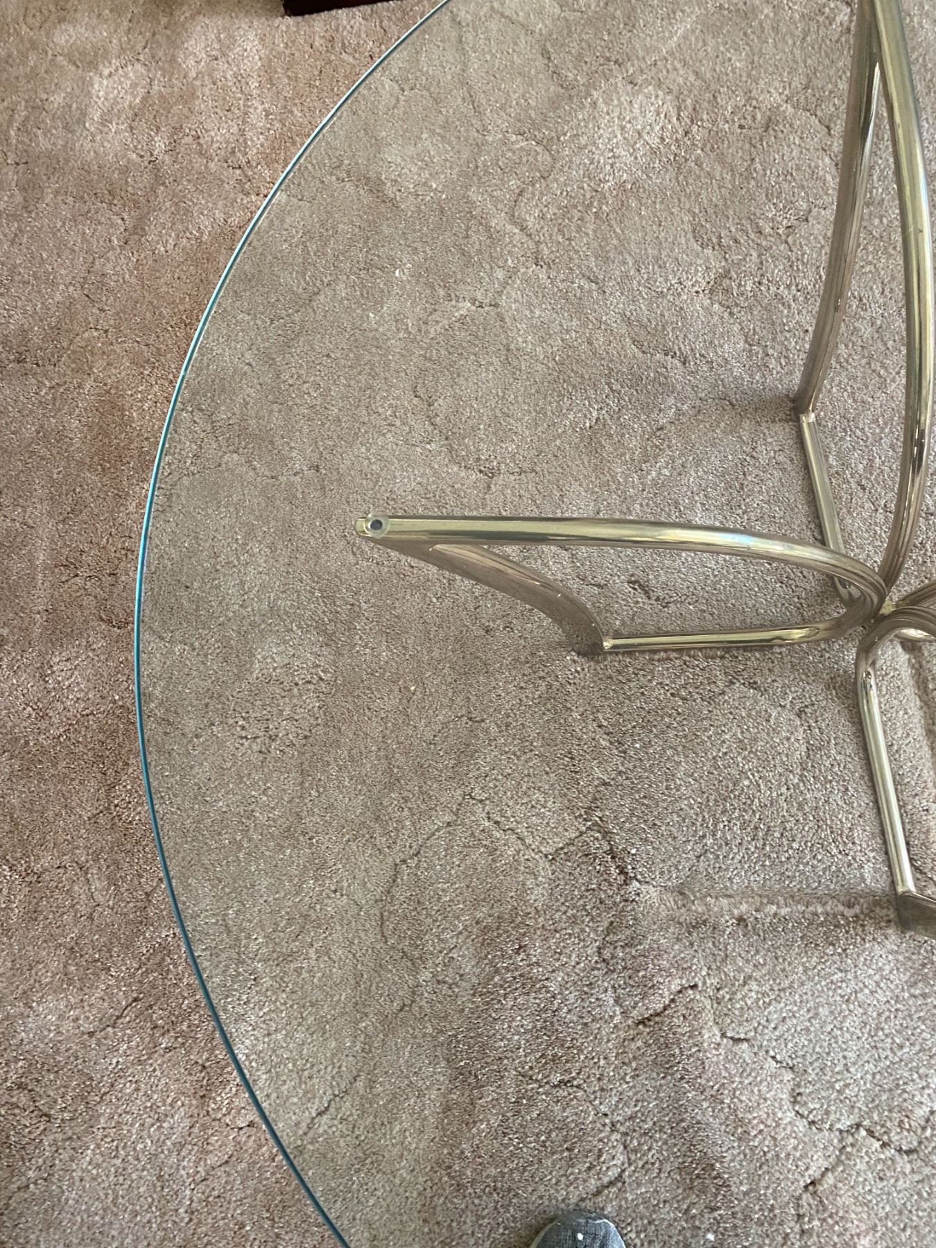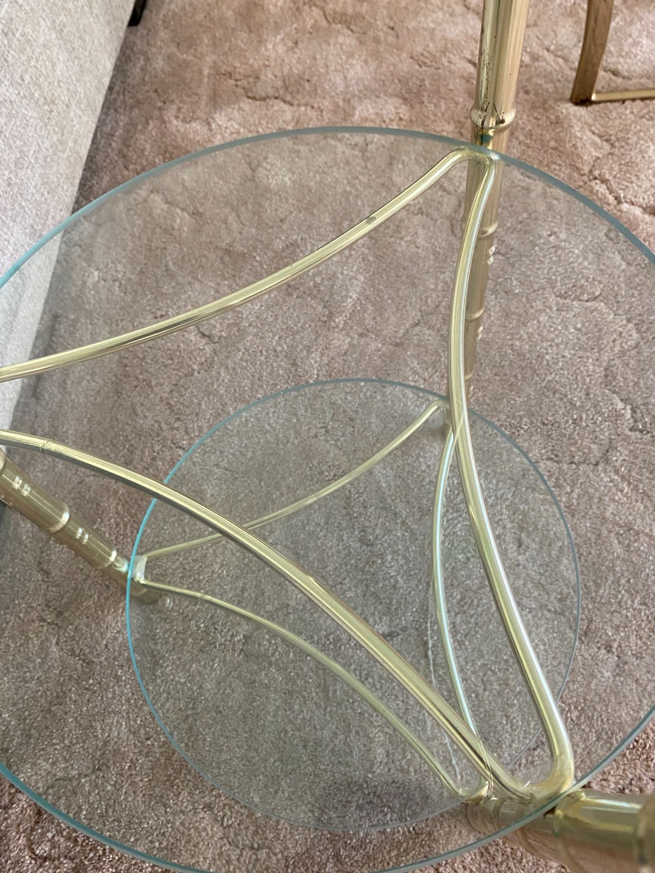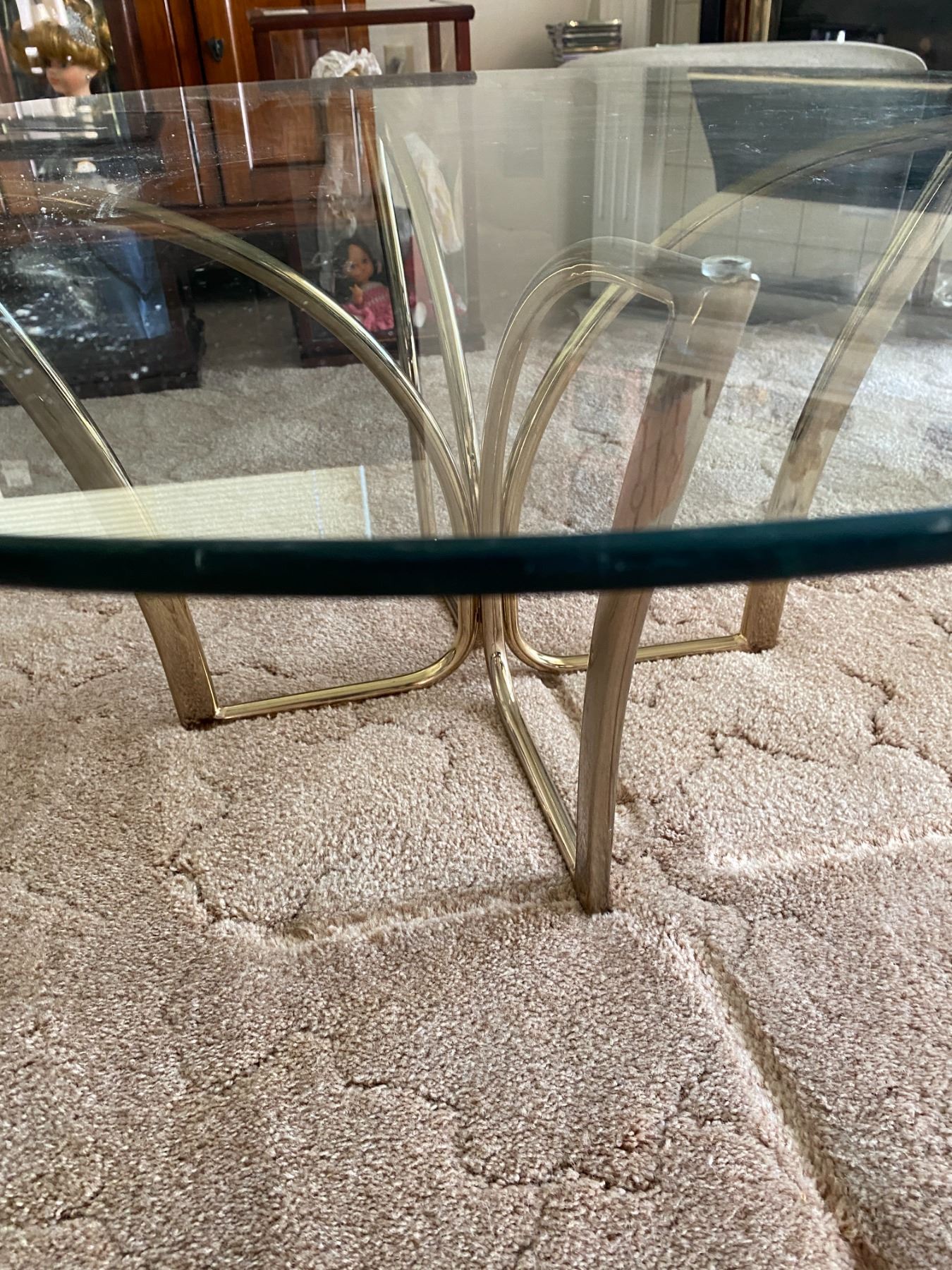 Glass and brass-tone table and stand. Coffee table is 36" diameter x 15"H. Stand is 28"H.