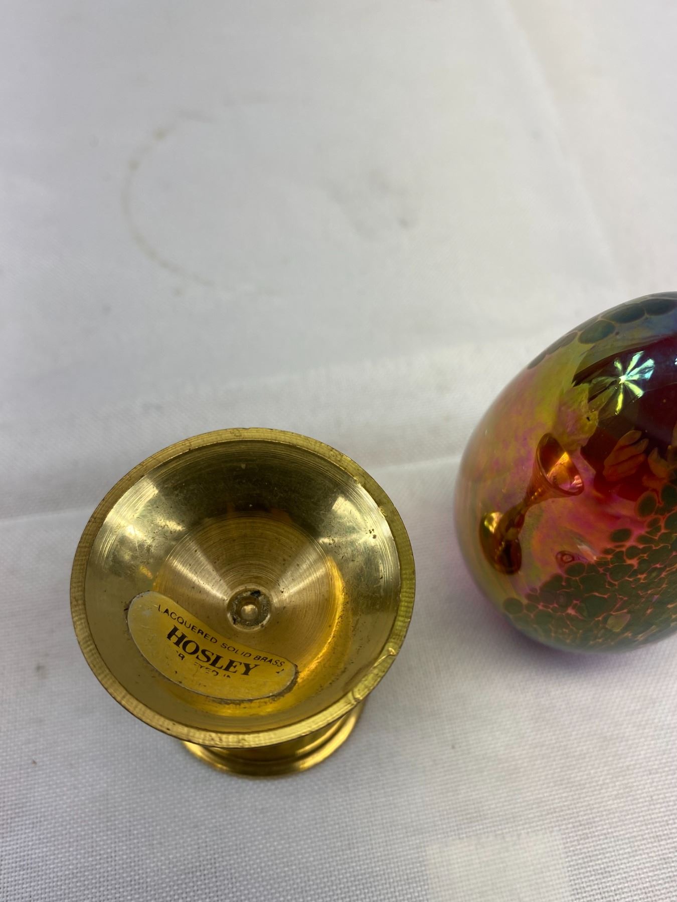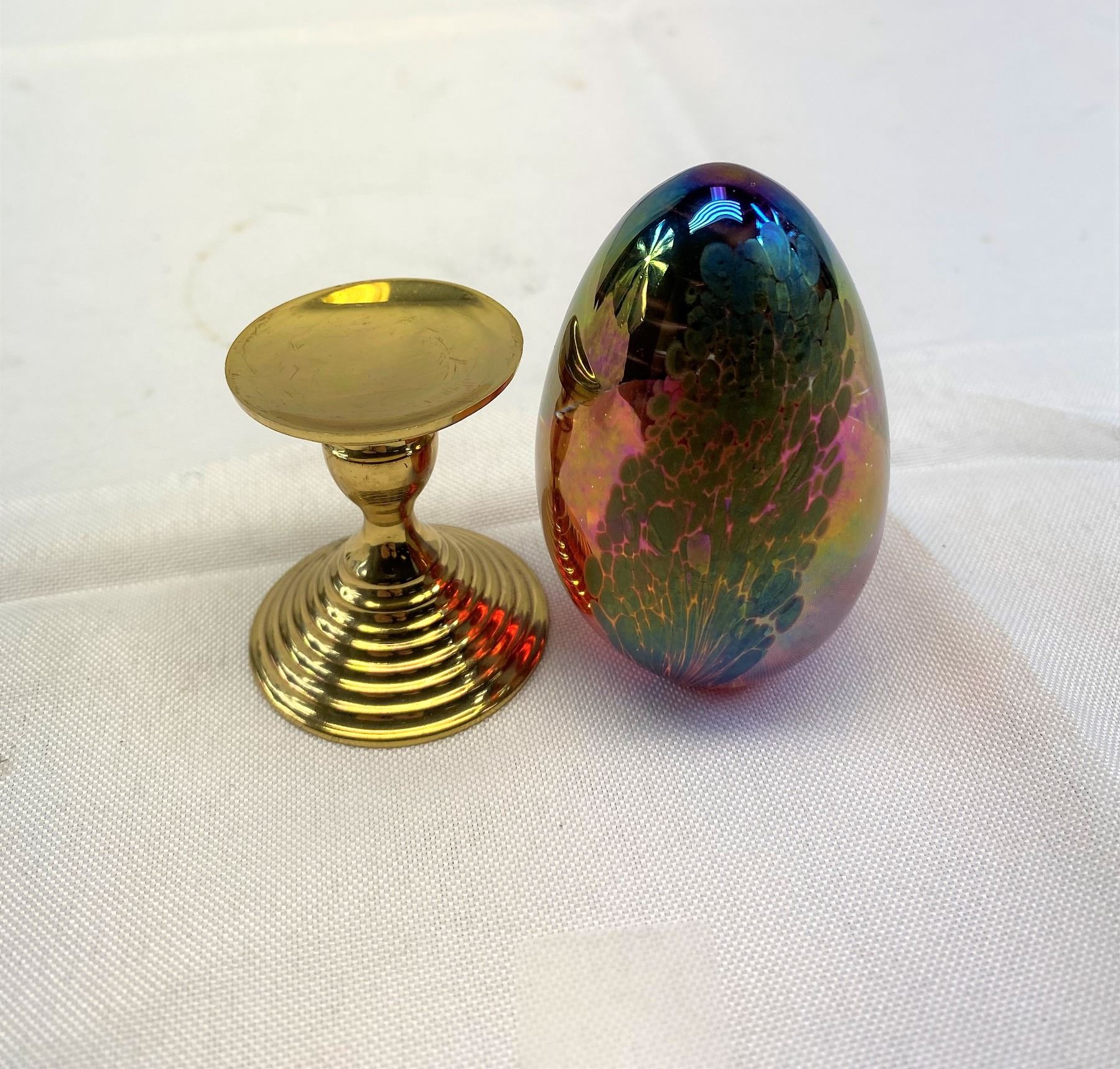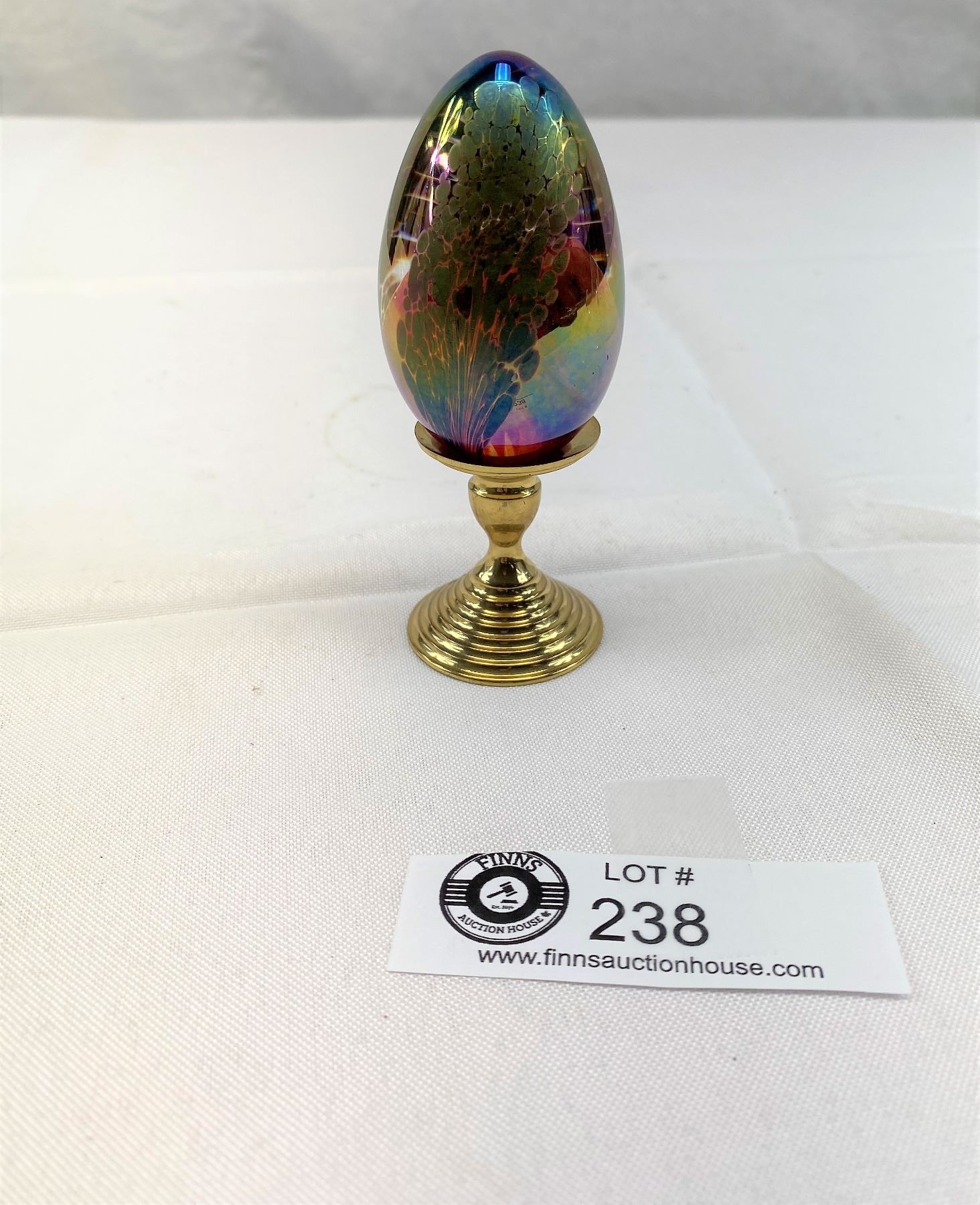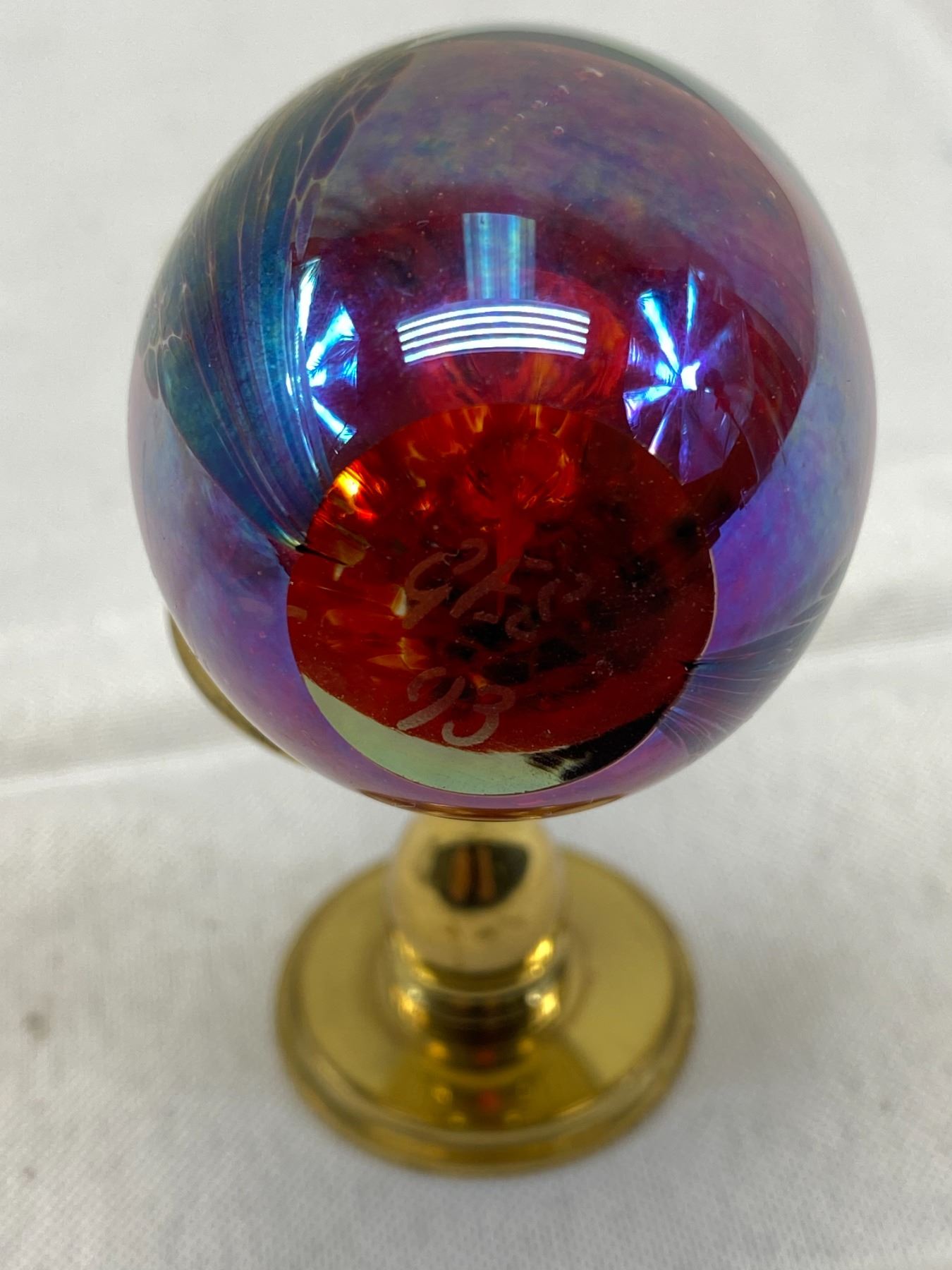 Glass Eye Studio, Iridescent Paperweight And Brass Hosley Stand, Signed Ges, 1993