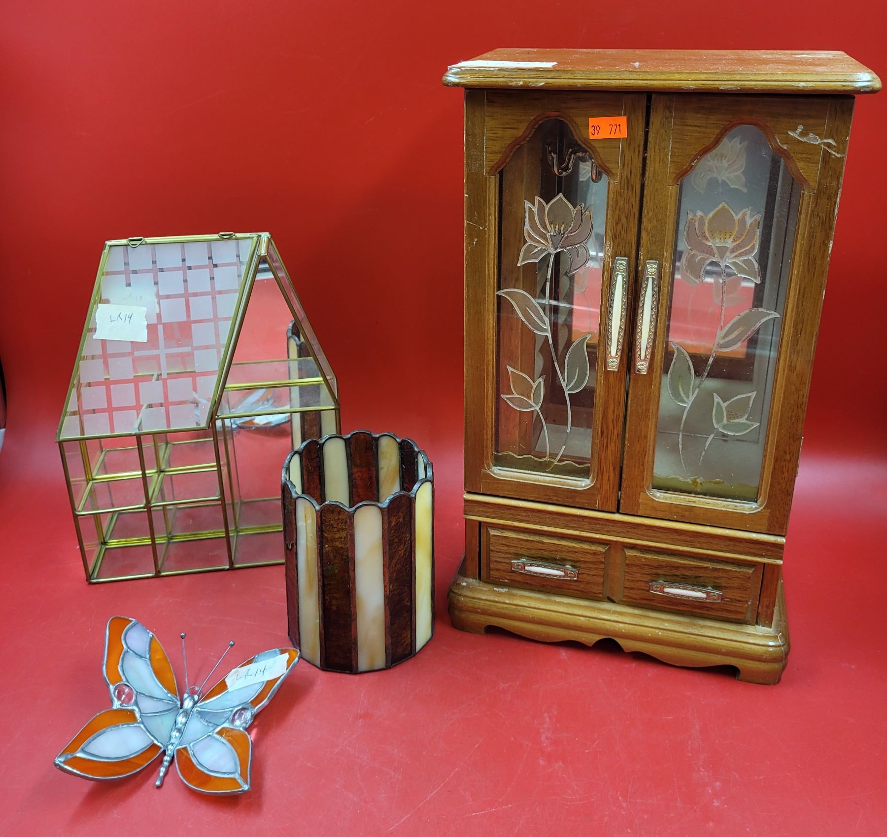 Glass Lot w/ Stained Glass Butterfly, Scallop Edge Candleholder, & More