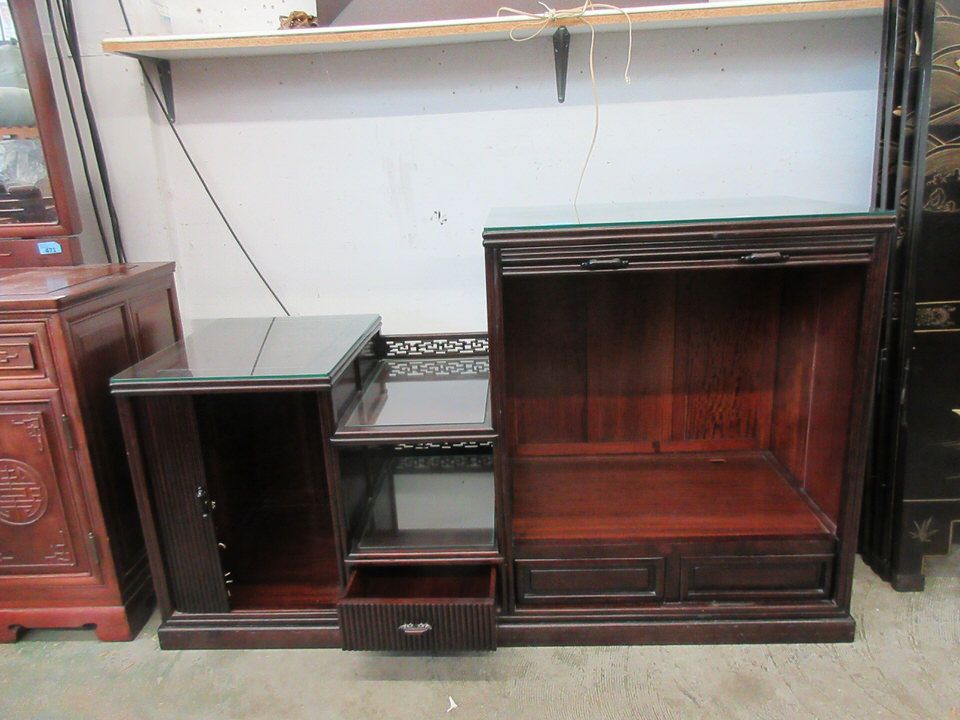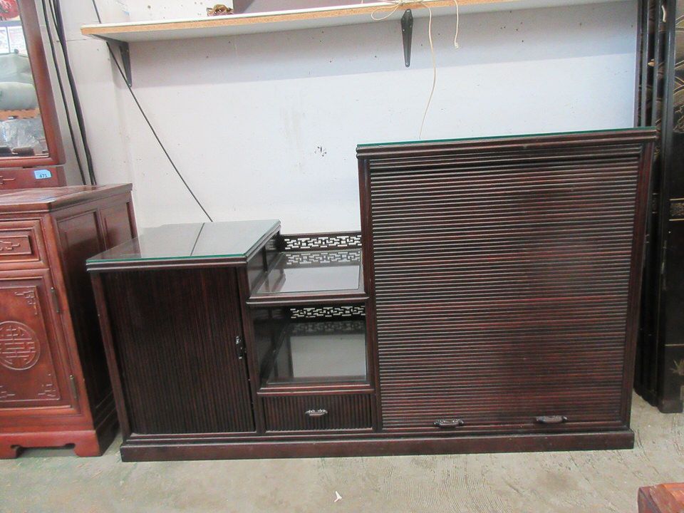 Tambour front with interior drawers. 20" x 52" x 32" tall. Companion piece to lot #474 (end tables)