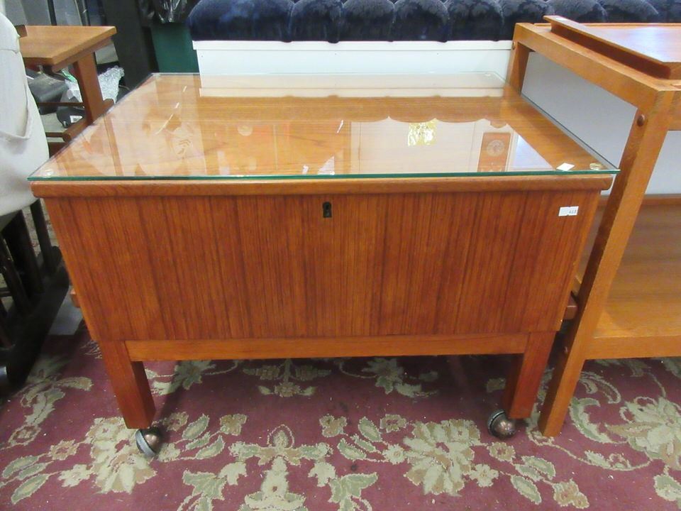Lift top. 20" x 26" x 20" tall. On casters.