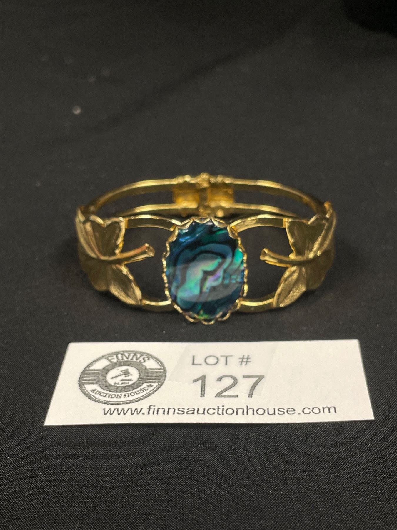 Gold Plated w/ Abelone Shell Stone Hinged Bangle