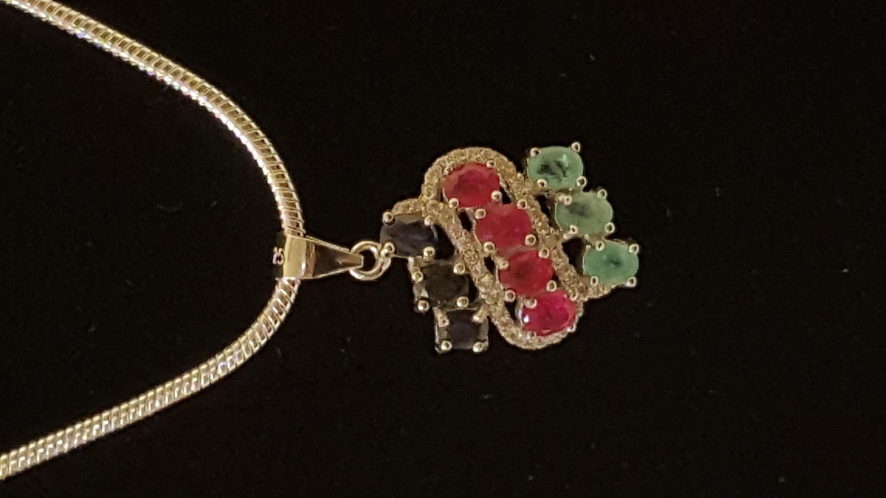 Gorgeous 11.5 ct Blue Sapphire, Ruby and Emerald Pendant Mounted In Solid .925 Sterling Silver. Pendant Includes 20 2 mm. Chain. 57 cttw.