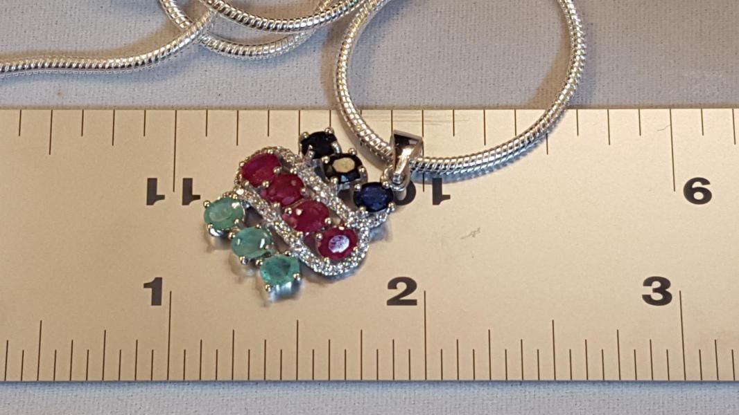 Gorgeous 11.5 ct Blue Sapphire, Ruby and Emerald Pendant Mounted In Solid .925 Sterling Silver. Pendant Includes 20 2 mm. Chain. 57 cttw.