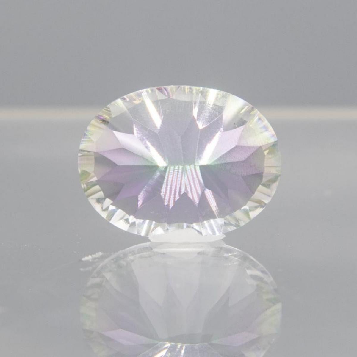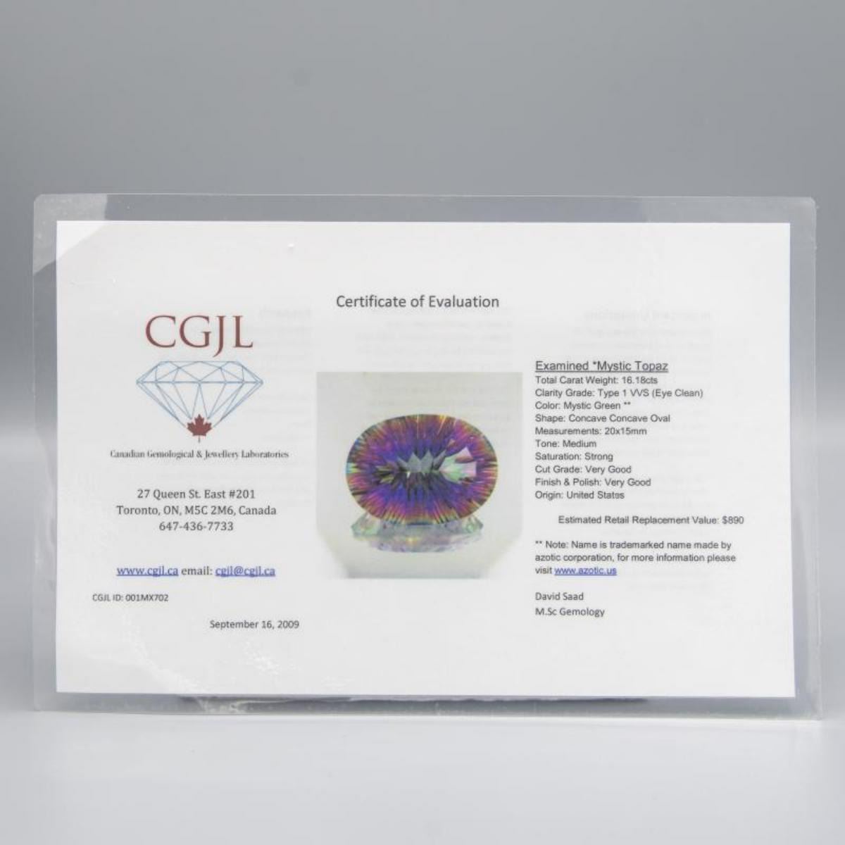 Gorgeous 16.18 Ct Certified Mystic Topaz Soliare. Fancy concave oval cut measuring 20 x 15 mm.This mystic topaz is VVS1 rated and includes certification card. The replacement value is $890. Please see certification for further details.
