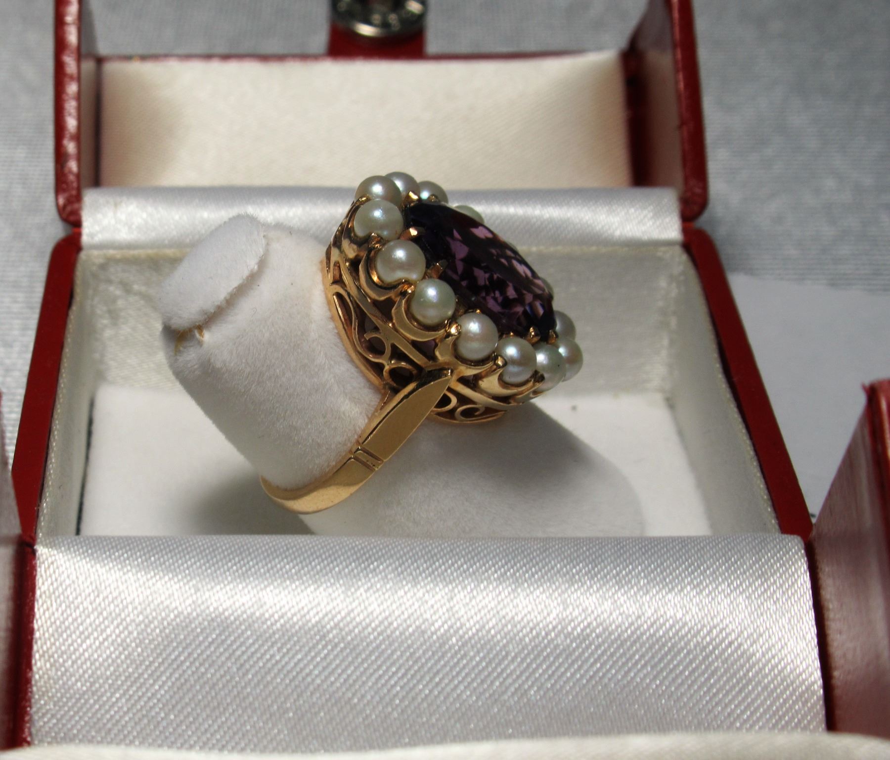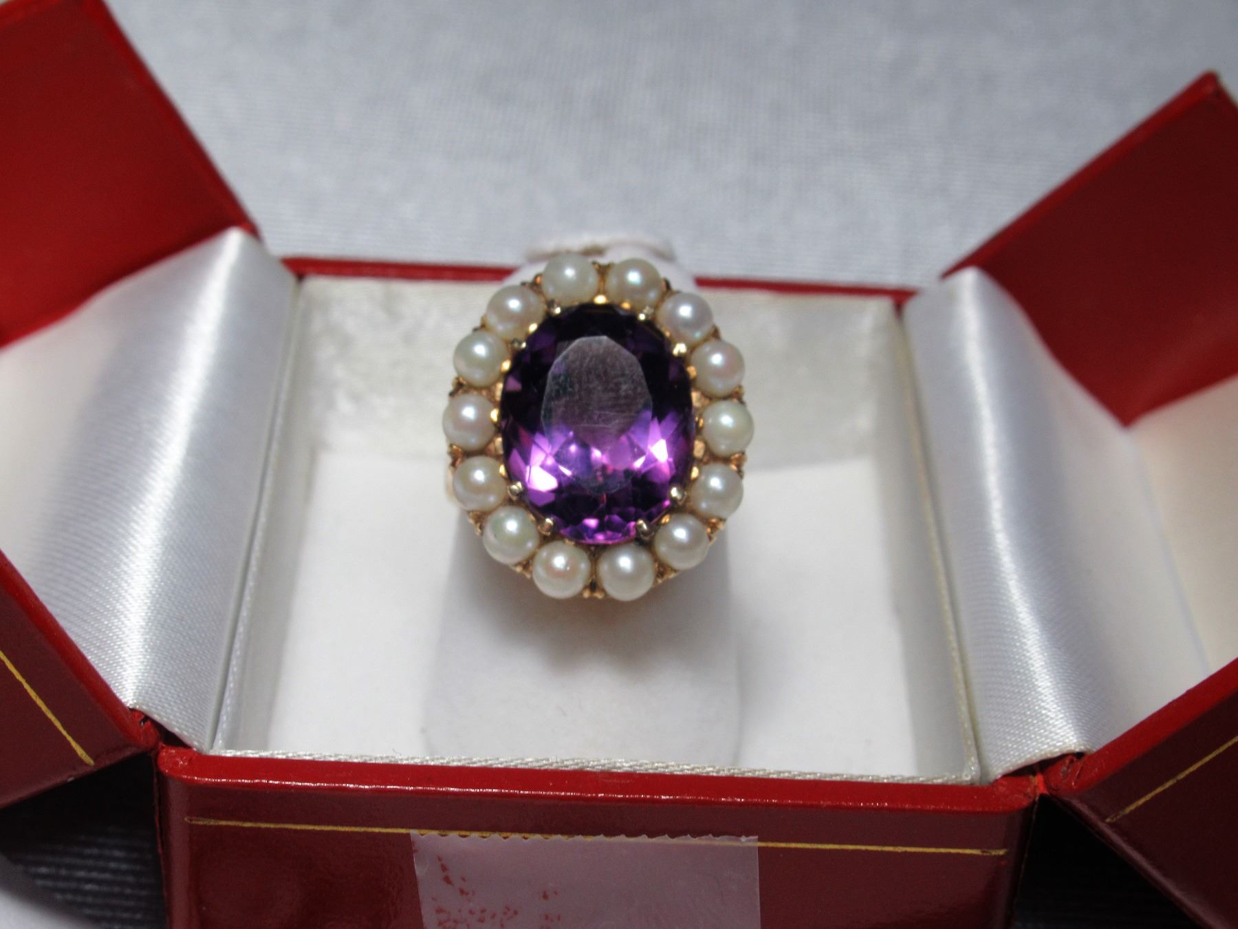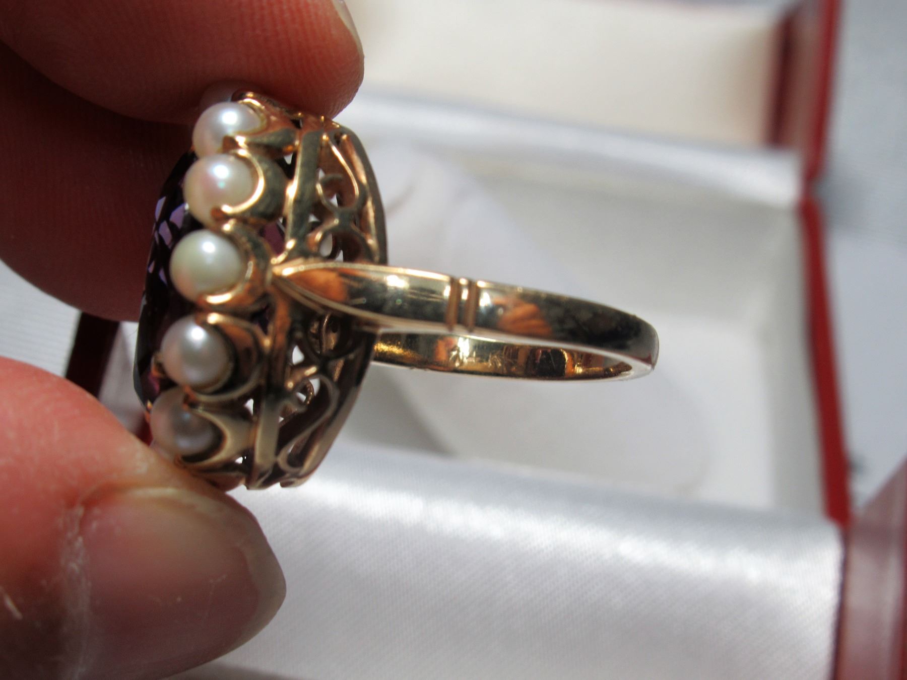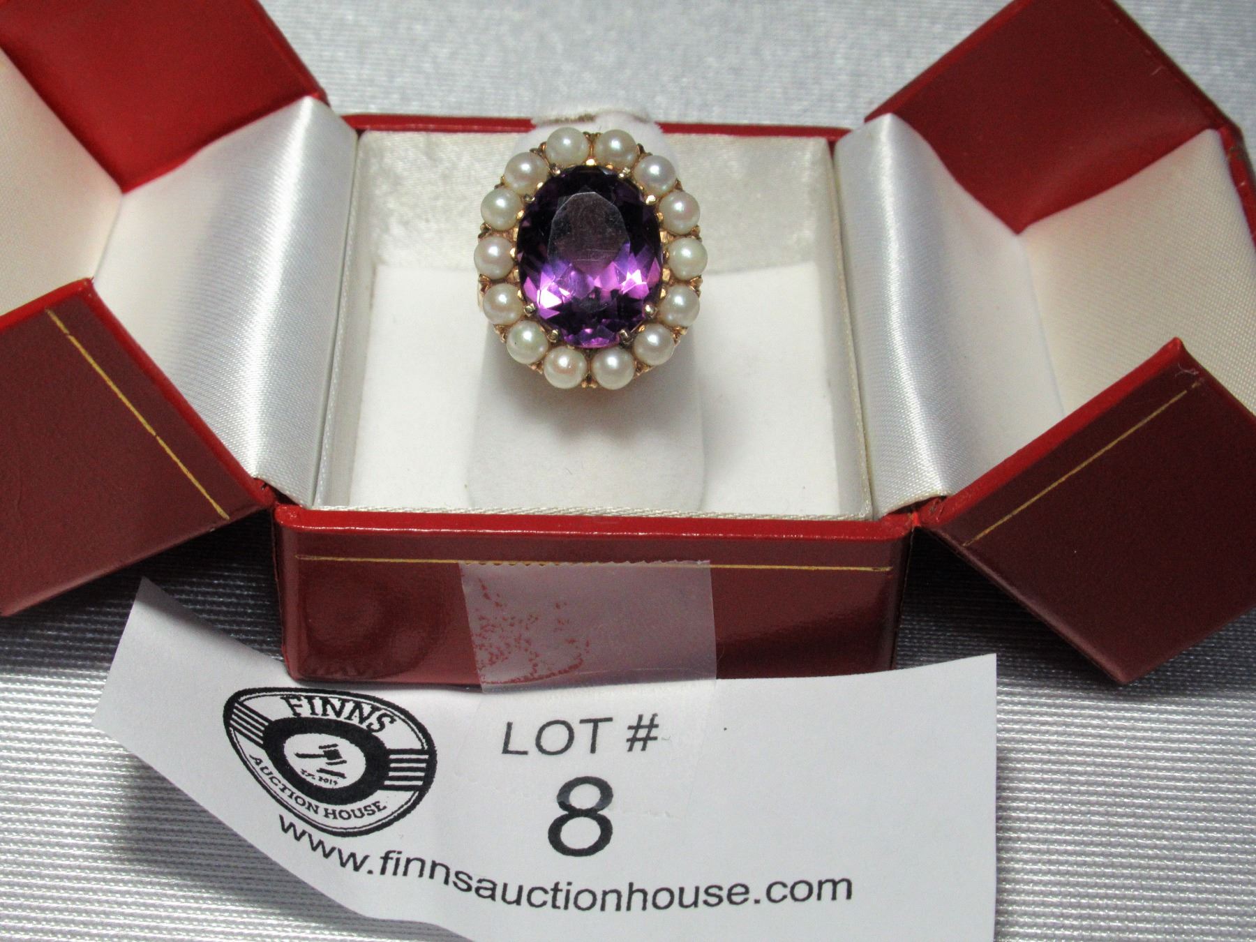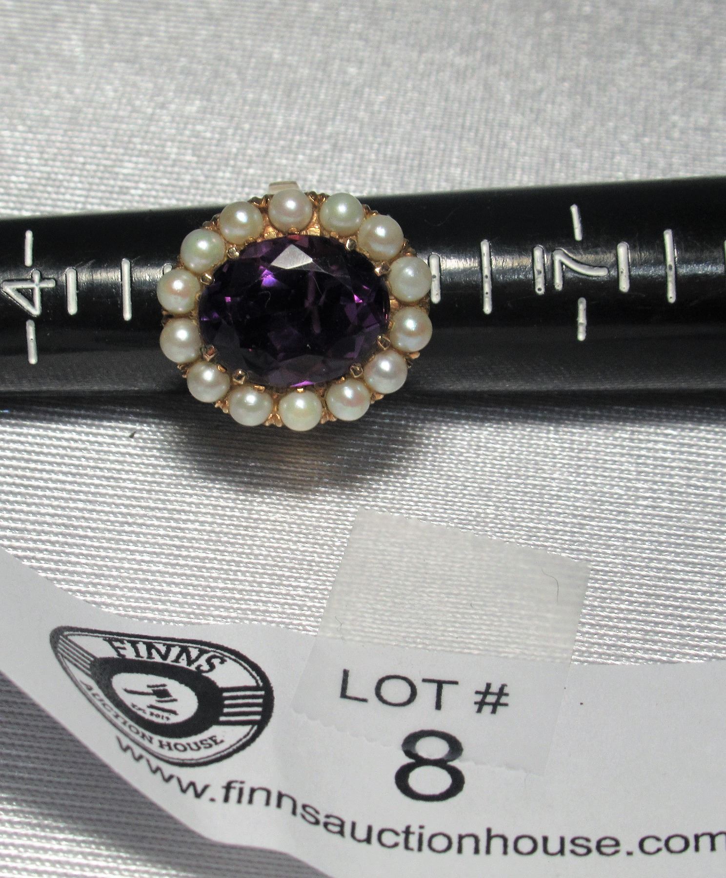 Gorgeous Antique 14k Gold Amethyst Seed Pearl Ring Amethyst measures approx 15mm x 12mm. Ring Size 6 7.8 Grams