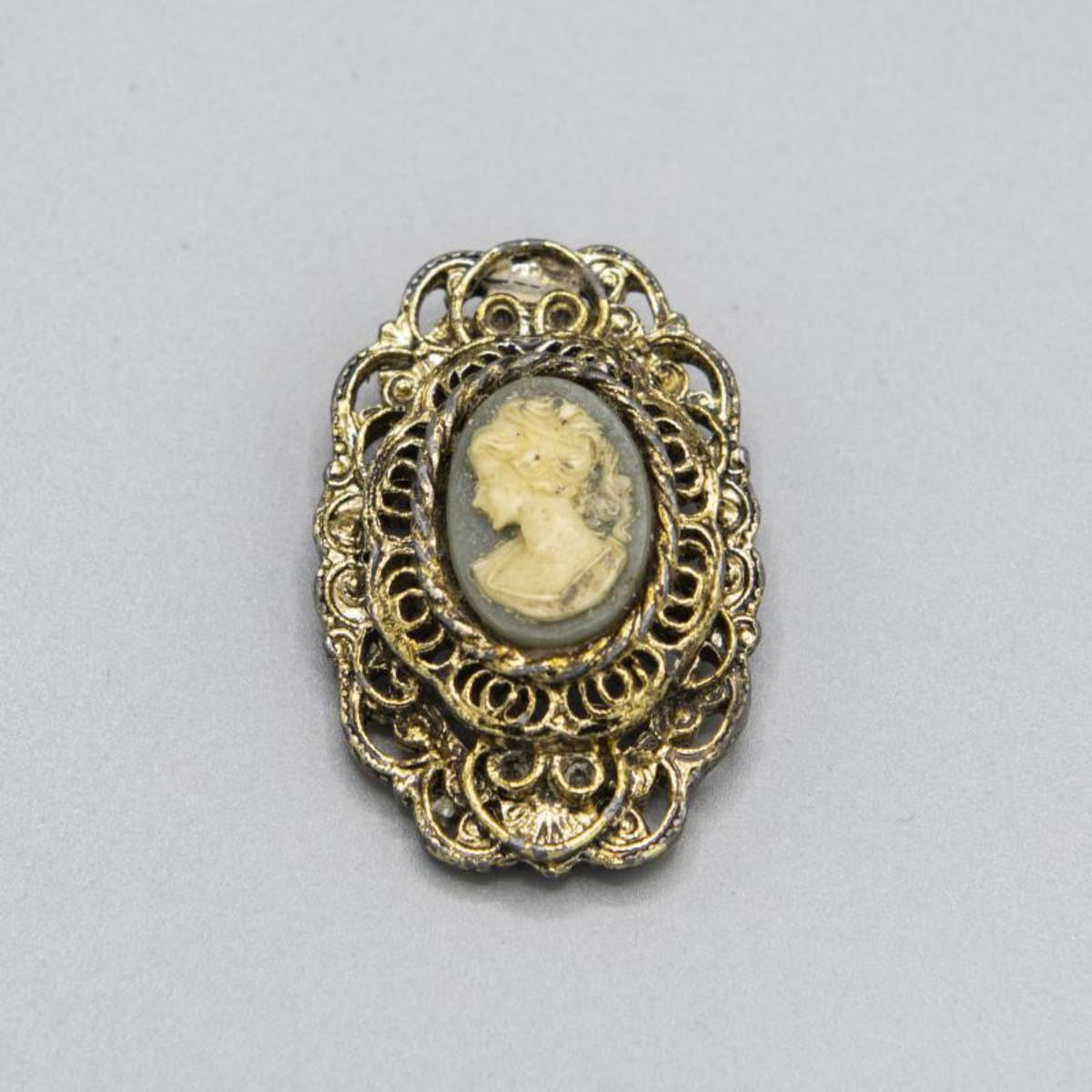 Gorgeous Cameo Pendant or Brooche Jewelry Piece. Has a loop foor the pendant along with an 18" chain and a pin if chosen to be worn as a bbrooche. Mounted in 10 Kt Gold Plate and is stamped Gerry. Approx 25 Total Gram Weight. Lovely worn as either a pendant or a brooche. You pick tyhe mood.