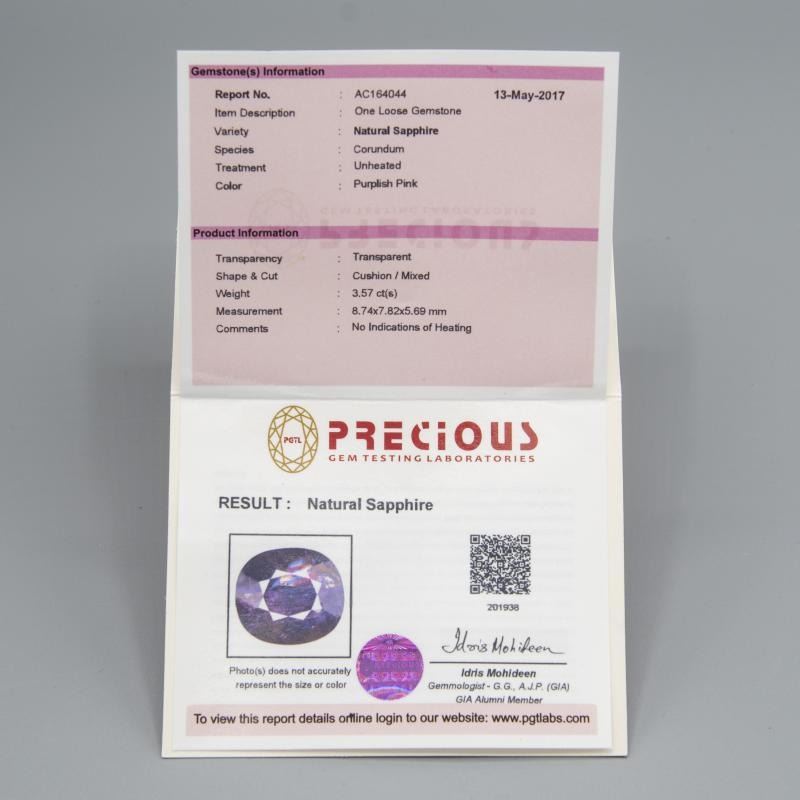 Gorgeous Rare Un-Heated Certified 3.57 Ct. Purplish/Pink Natural Sapphire.This natural sapphire is a fine oval cut measuring 8.74 x 7.82 x 5.69 mm. Eye clean. Ready to mount.Please see certification for further details