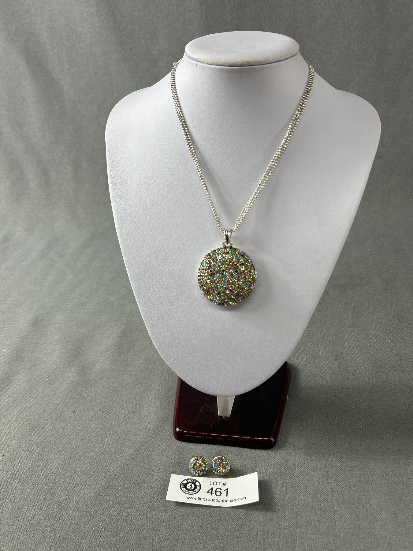 Gorgeous Silver Plated with Lots of Different Colours of Tiny Rhinestones Pendant Necklace with Matching Earrings