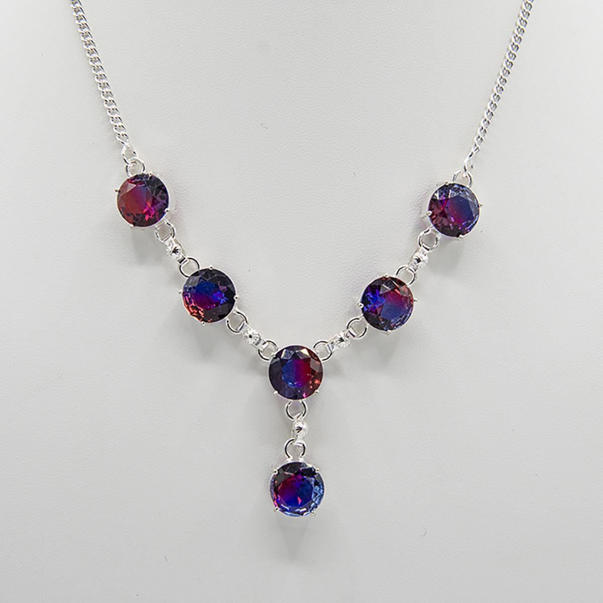 Gorgous 2 Piece 47.5 Ct Color Change Lab Alexandrite Jewelry Set.This set includes an eye clean 47.5 ct. necklace and earrings to match. Mounted in .925 sterling silver overlay. The Necklace Is 18" Long. Cttw for bith is 125.5 or 25.1 Total Gram Weight. Don't Miss This One. So Unique And Beautiful