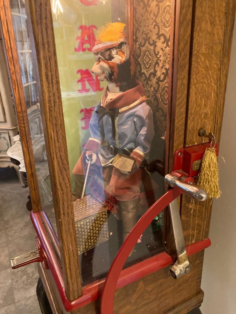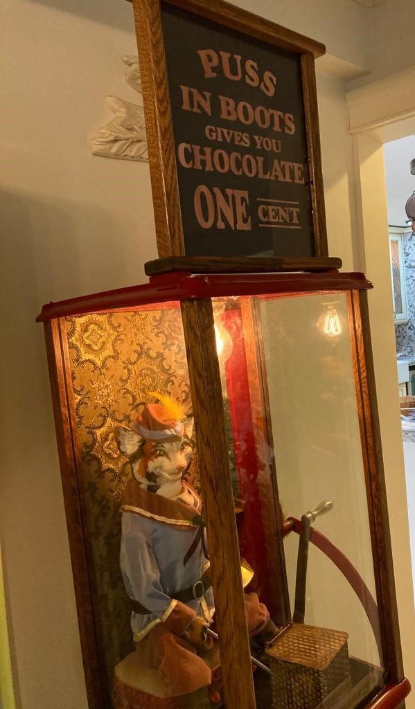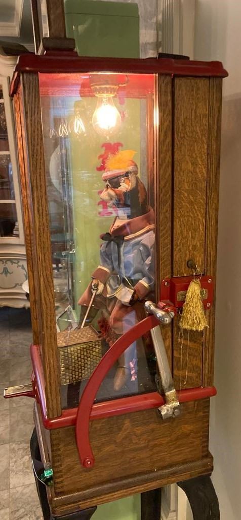 Amazing Gorski recreation of the 1890`s – 1920 Roover Brothers NY clock motor penny arcade chocolate vendor. Upon inserting a penny and pulling the handle down to retract the penny and wind the clock motor, the life size cat springs to life in a complex series of movements resulting in its retrieval of a chocolate and dumping in chute for the patron to receive. Modern day Andes chocolates work in the machine. Absolutely breathe taking in person. Extremely rare and sought after by collectors around the world. Estimate $7500-$35000 USD. Very rare.