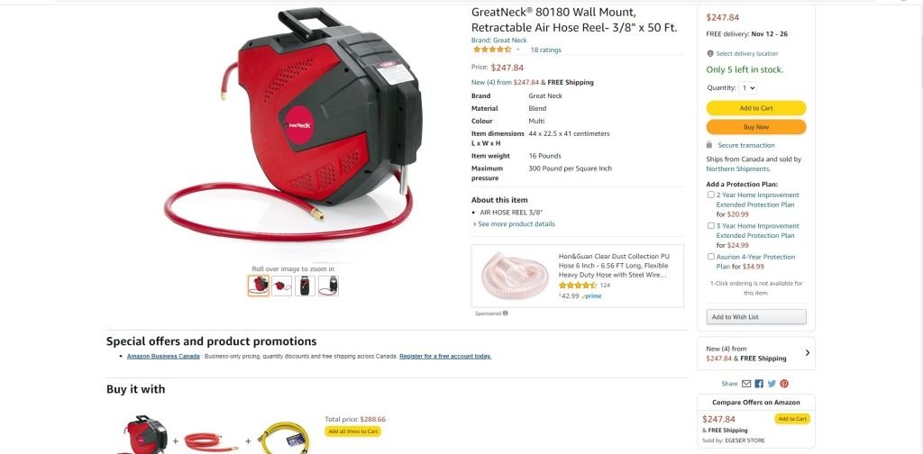 GreatNeck Wall Mount, Retractable Air Hose Reel- 3/8" x 50 Ft. Retail $247