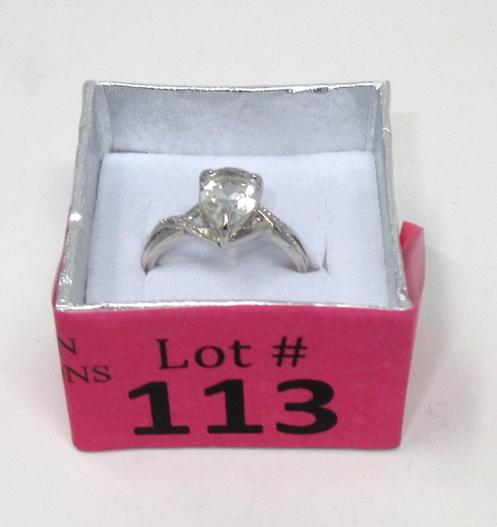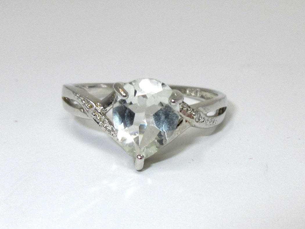Sterling silver. Pear cut amethyst & 2 side diamonds. Cross over design shank. Retail value $275.