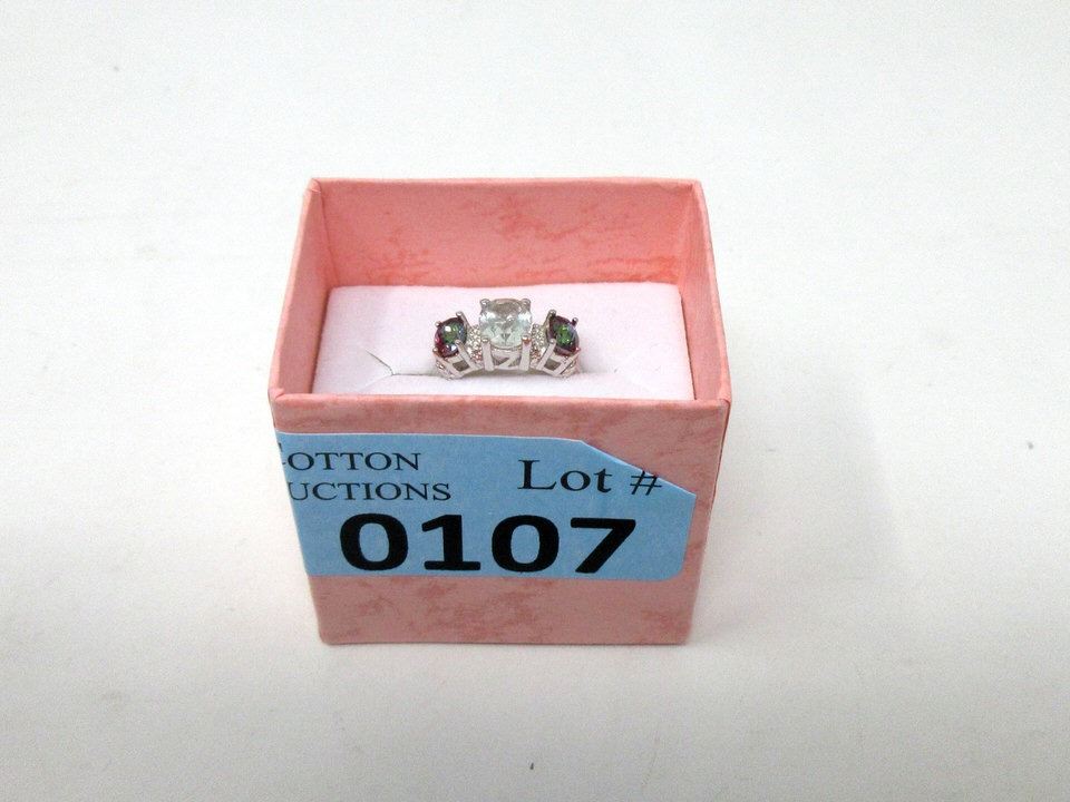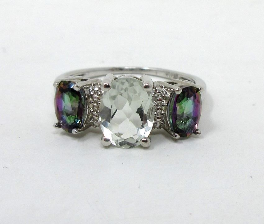 Oval amethyst center stone with 2 round mystic topaz & 2 diamonds, set in sterling silver. Includes a $320 certificate.