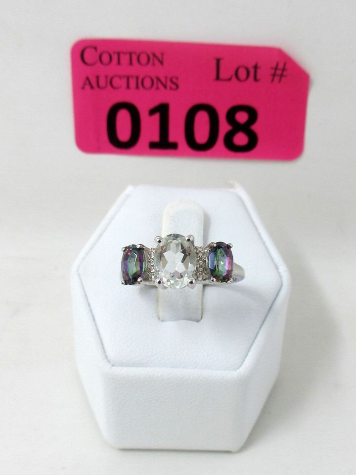 Oval amethyst center stone with 2 round mystic topaz & 2 diamonds, set in sterling silver. Includes a $320 certificate.
