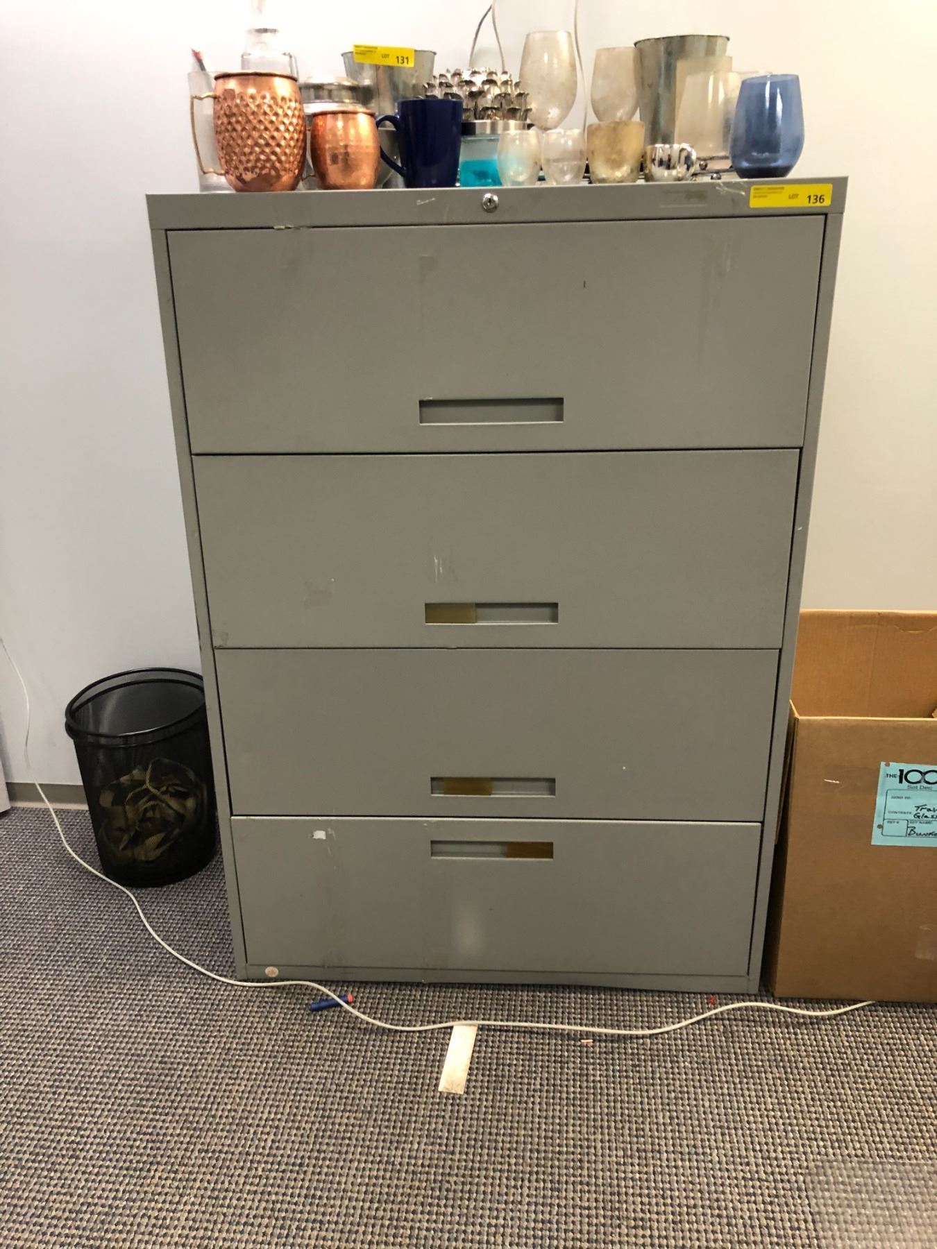 Grey 4 door metal lateral filing cabinet from the production office of the show