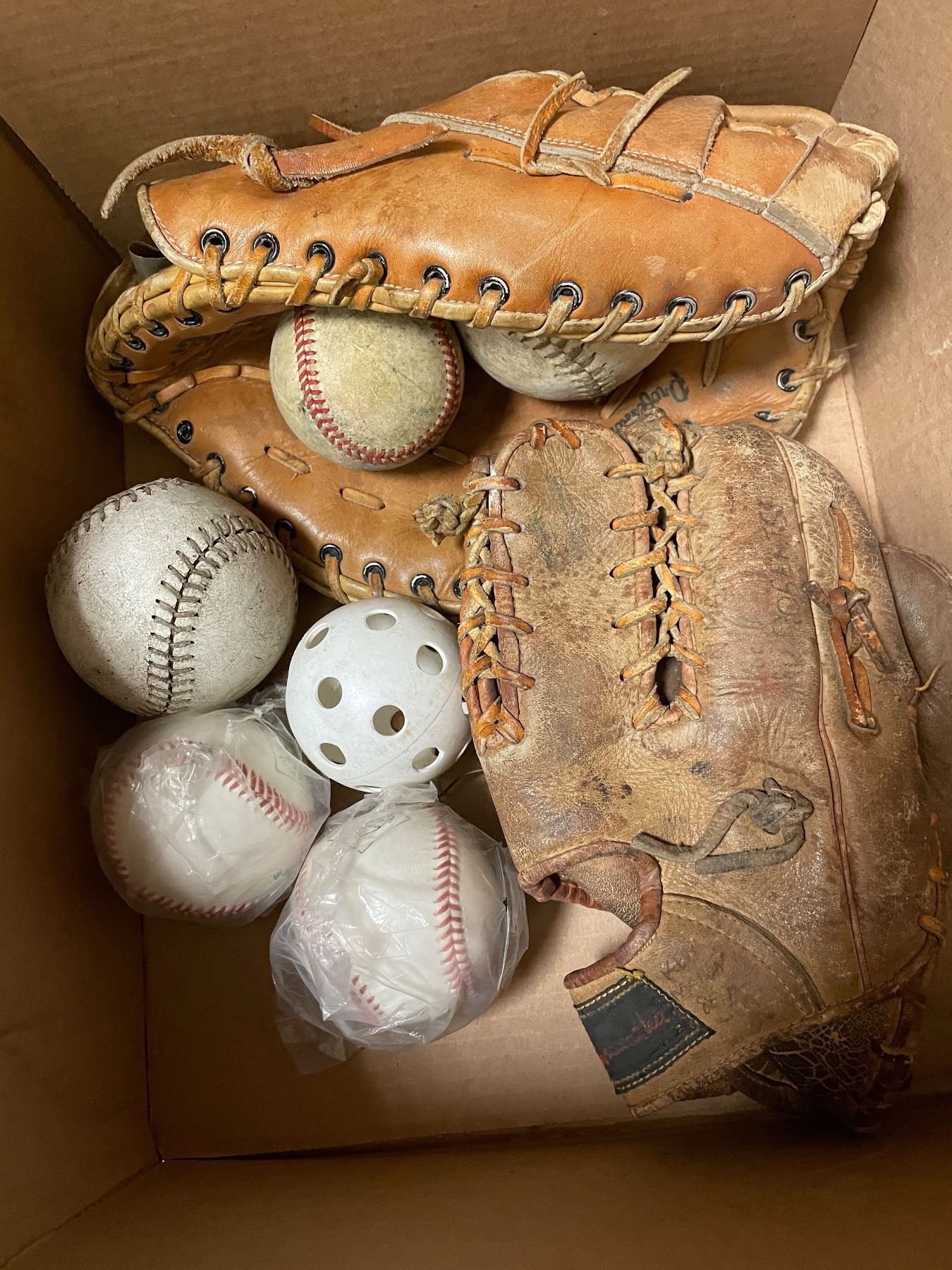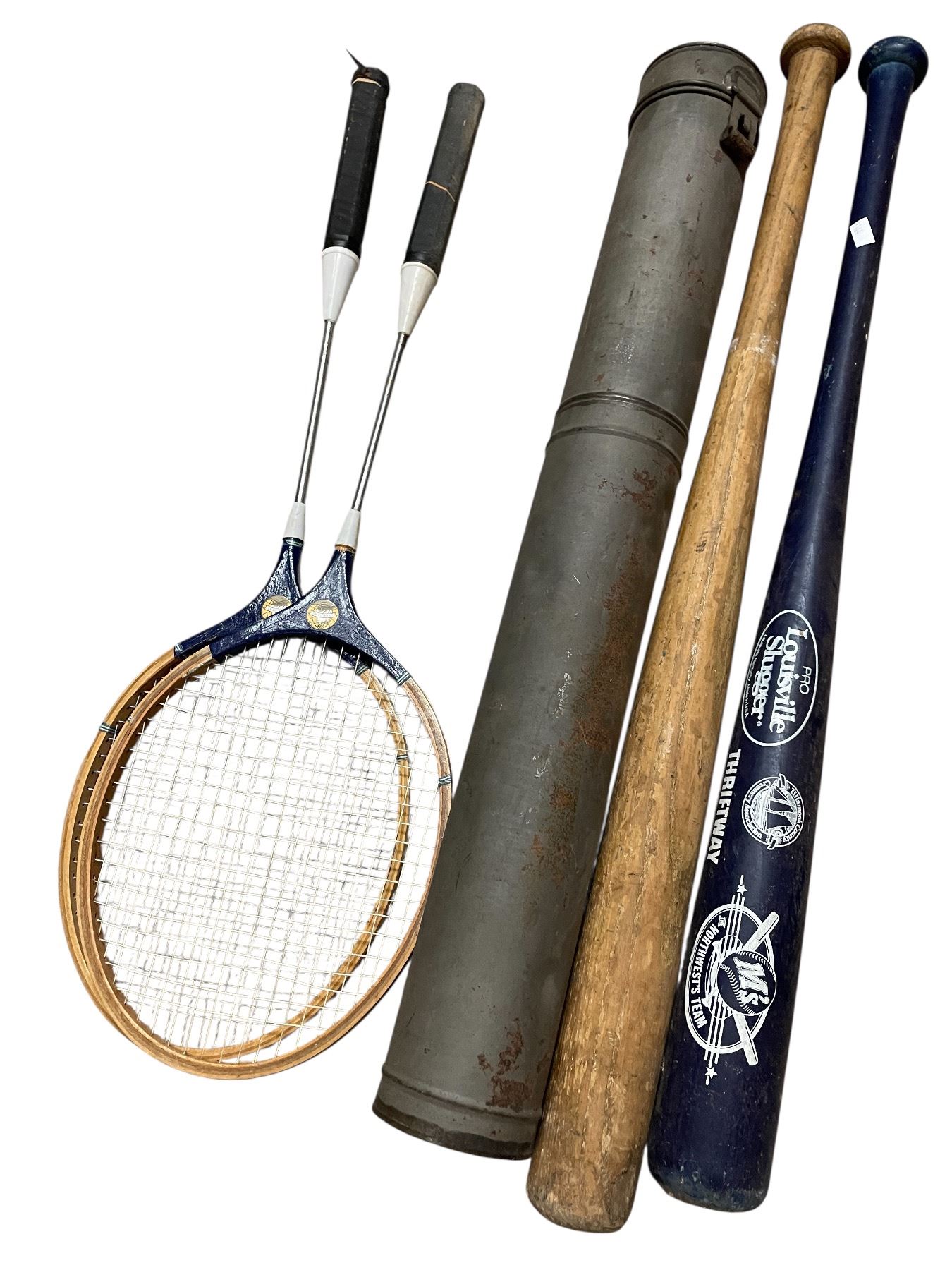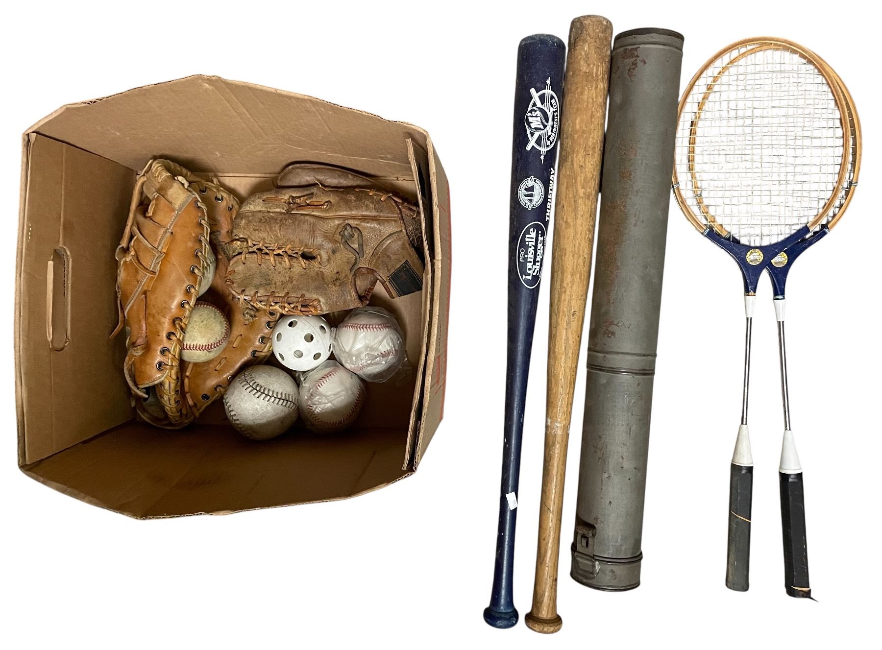 Group - Vintage sports equipment including badminton racquets, baseball gloves & bats, etc.