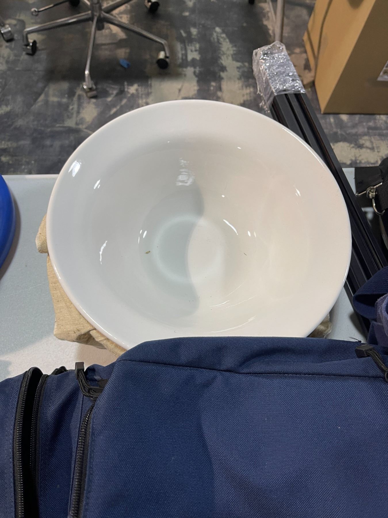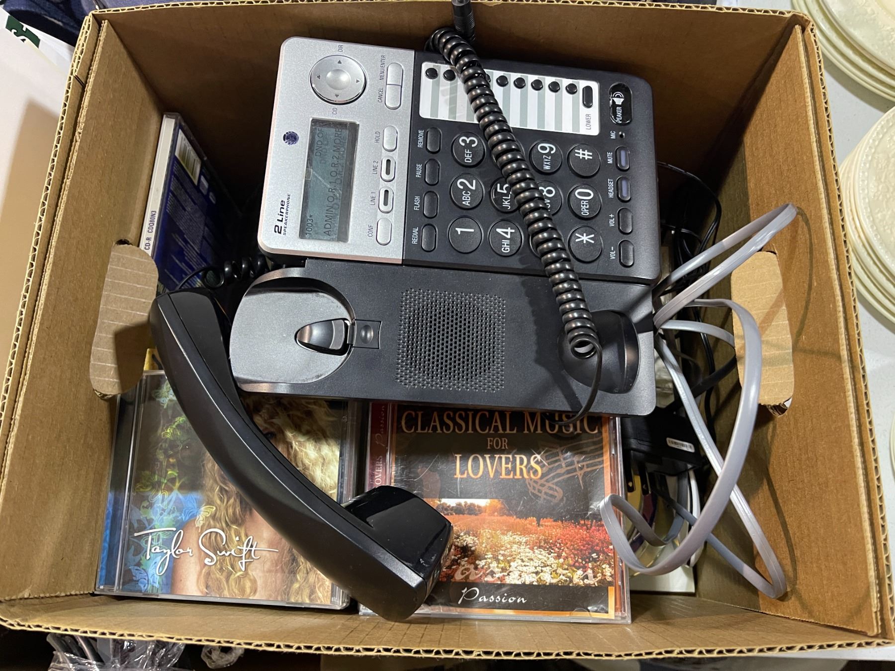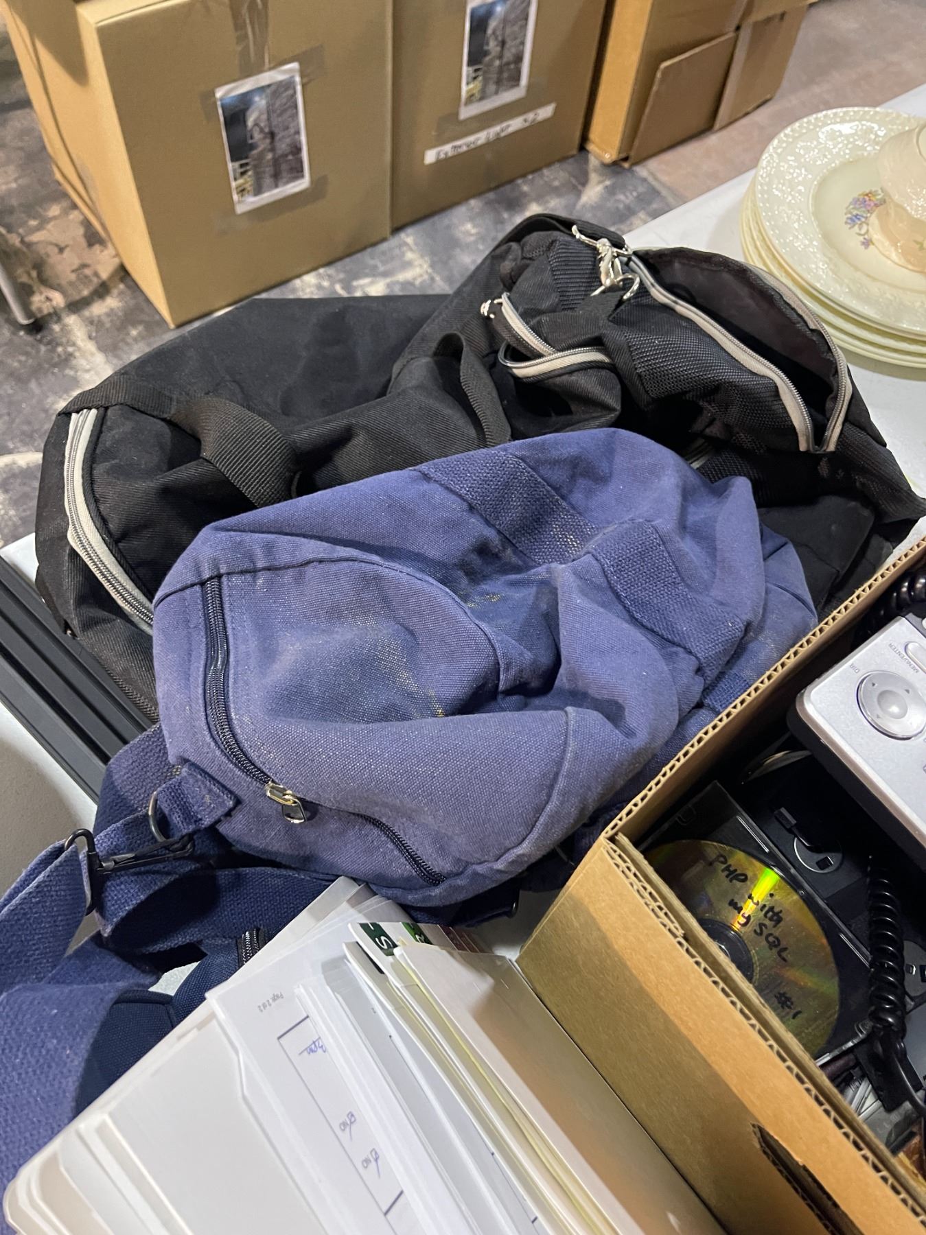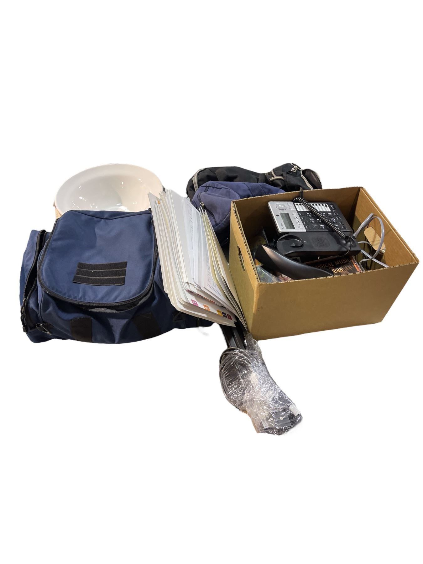 Group lot - Box of DVDs / telephone / duffle bags / track for track lighting / bowls / medical bag