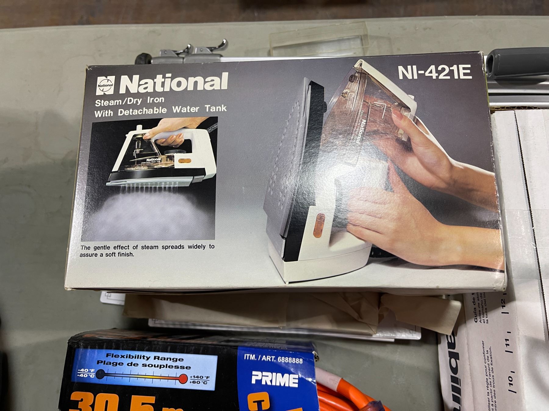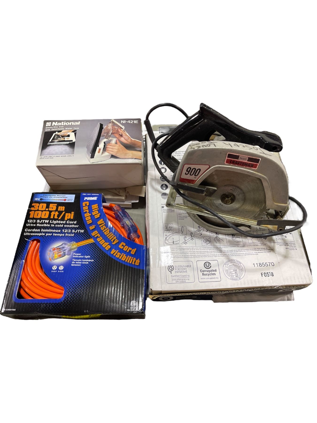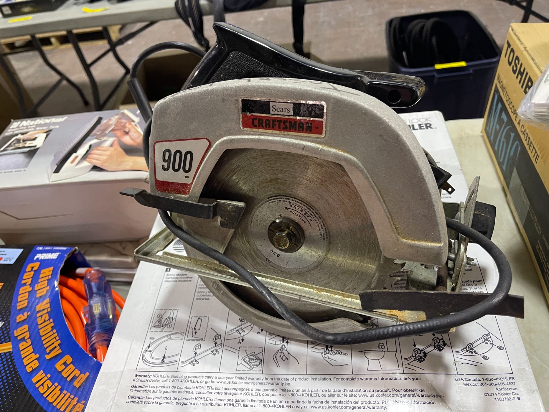 Group lot - Craftsman skill saw / Kohler faucet / Iron / Tripod / Extension cord / Oil drain trays / Water Bottles