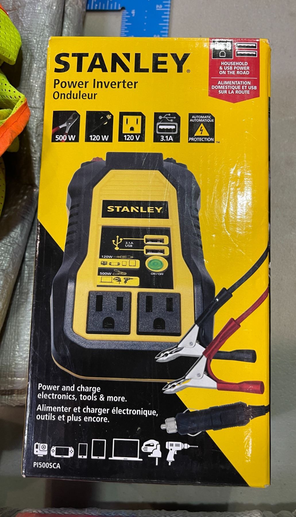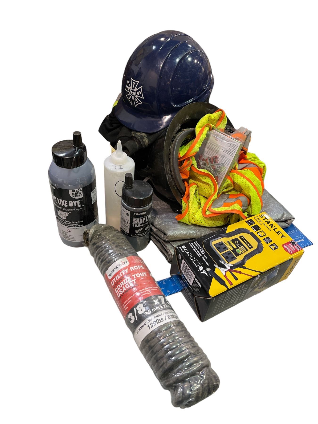 Group lot - Misc construction clothing & tools (Including hard hats / power inverter / high vis vest / etc.)