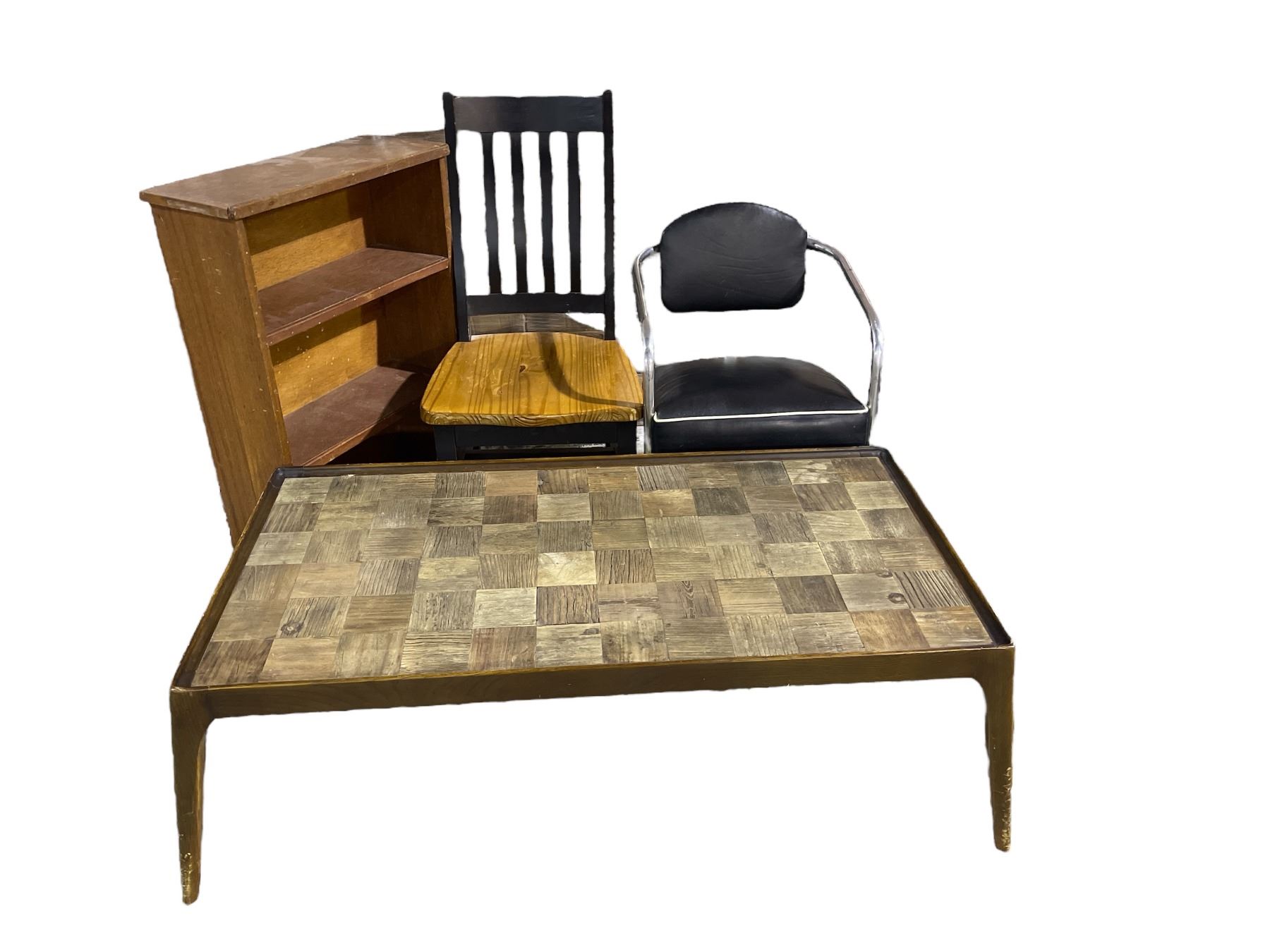 Group lot - Solid wood coffee table (26x49x16") - Small shelf (25x9x36") - x2 Chairs