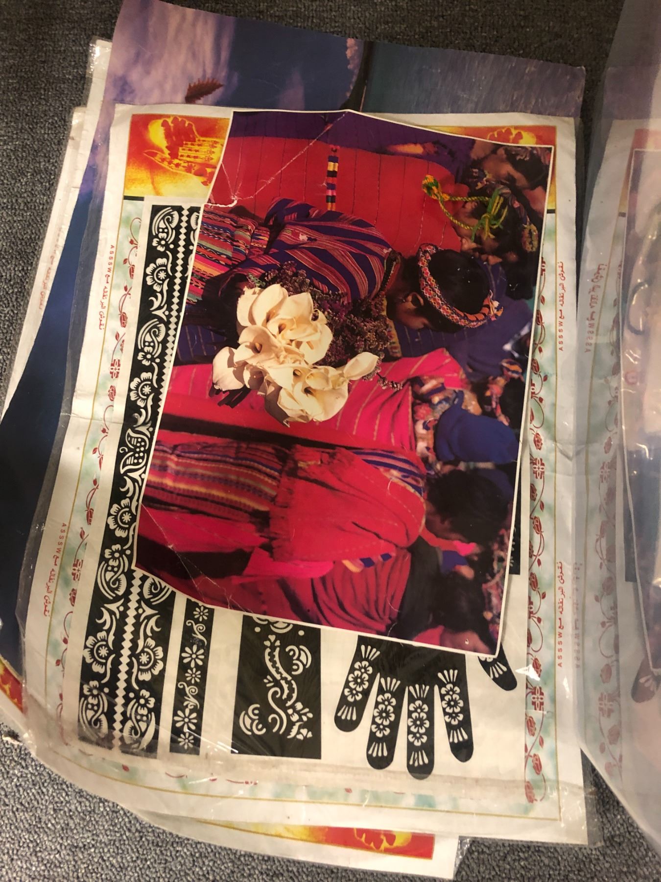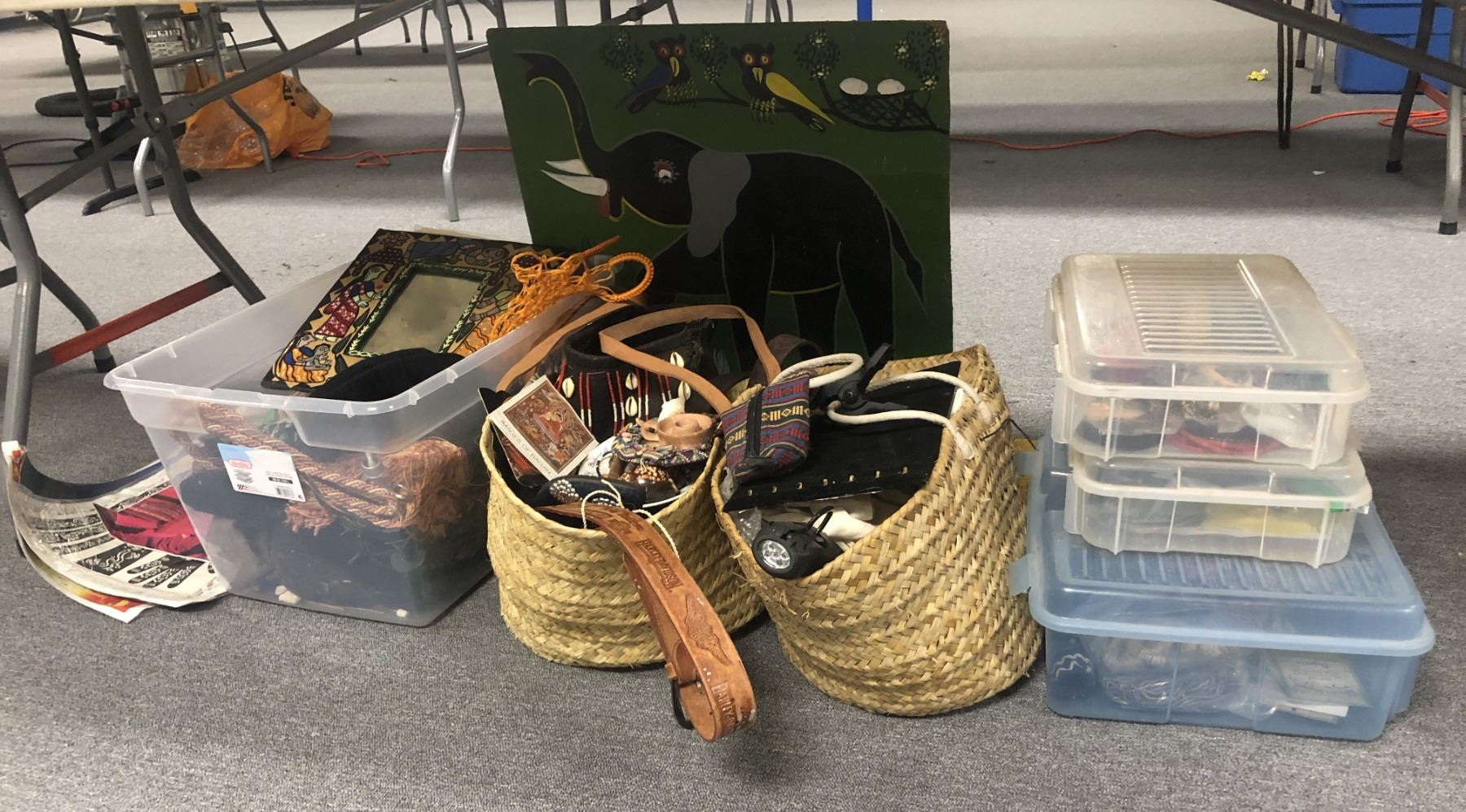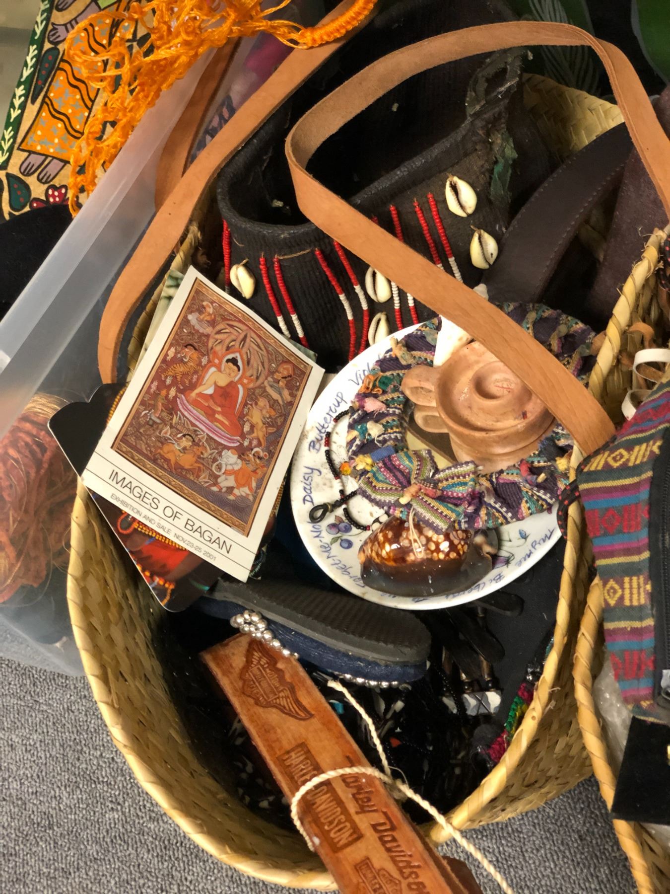 Group lot of assorted items - includes Elephant paint (approx 24" x 24") / medicine divider bag / beaded necklaces / African hats etc
