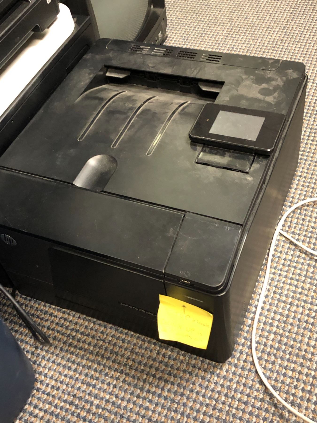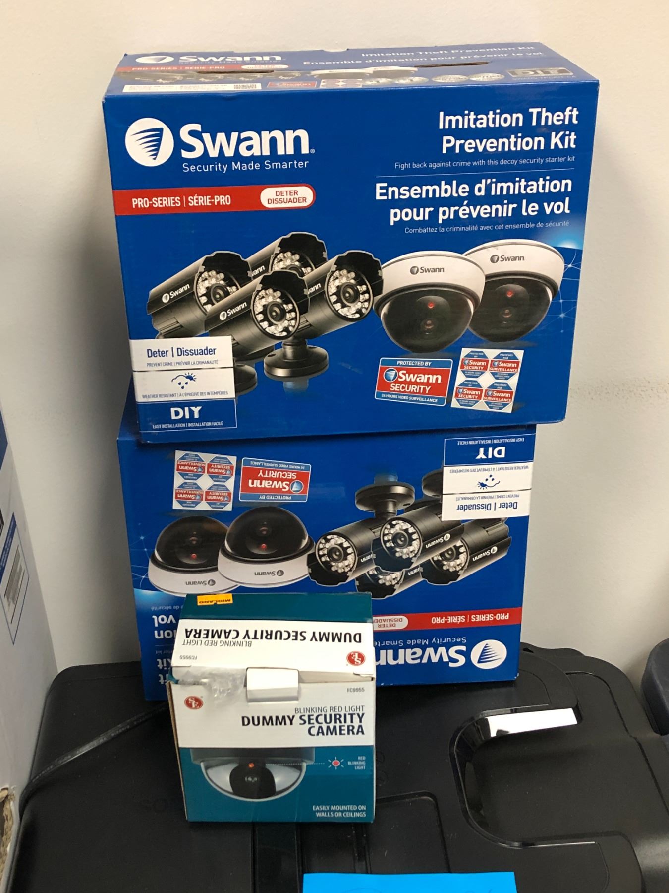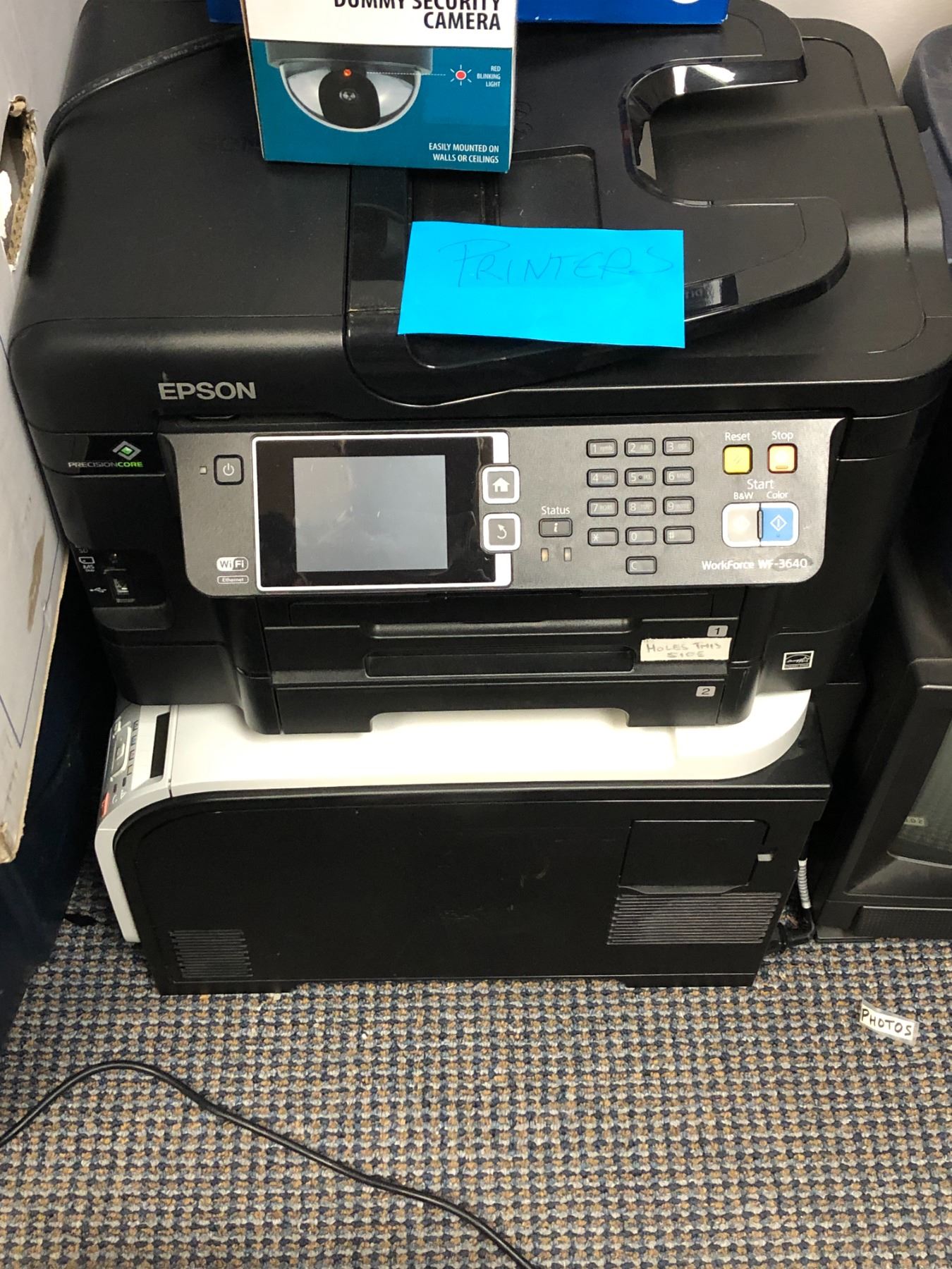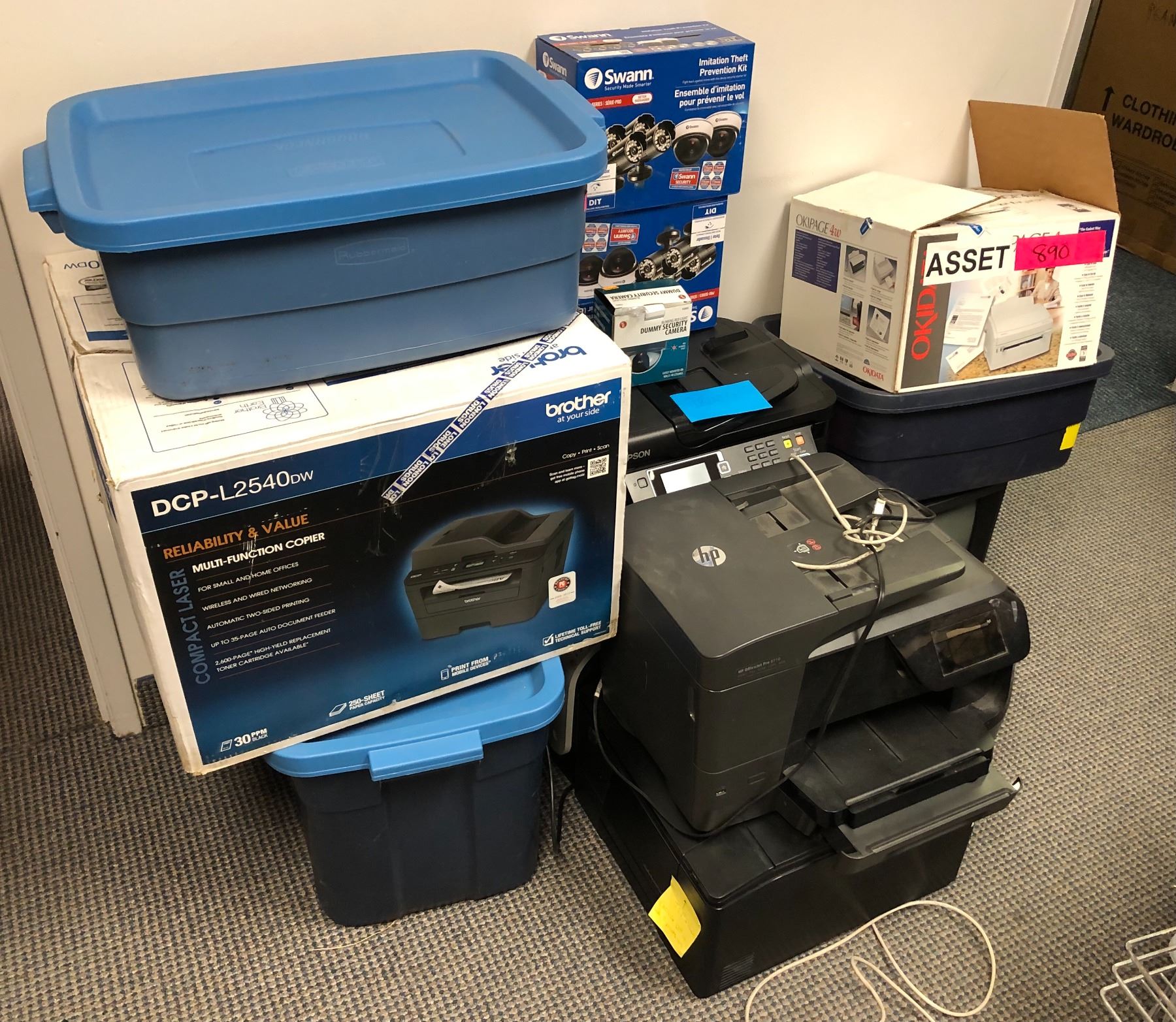 Group lot of items - includes printers (approx 8) / security cameras & black portable tv