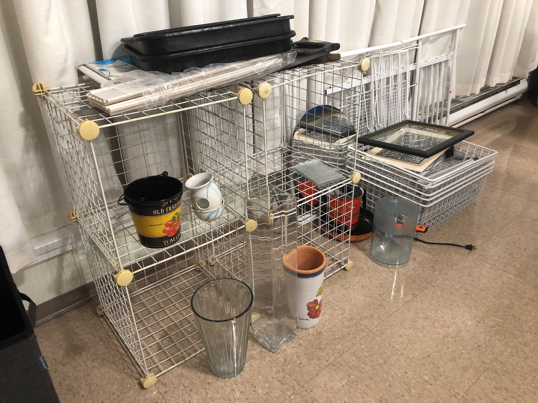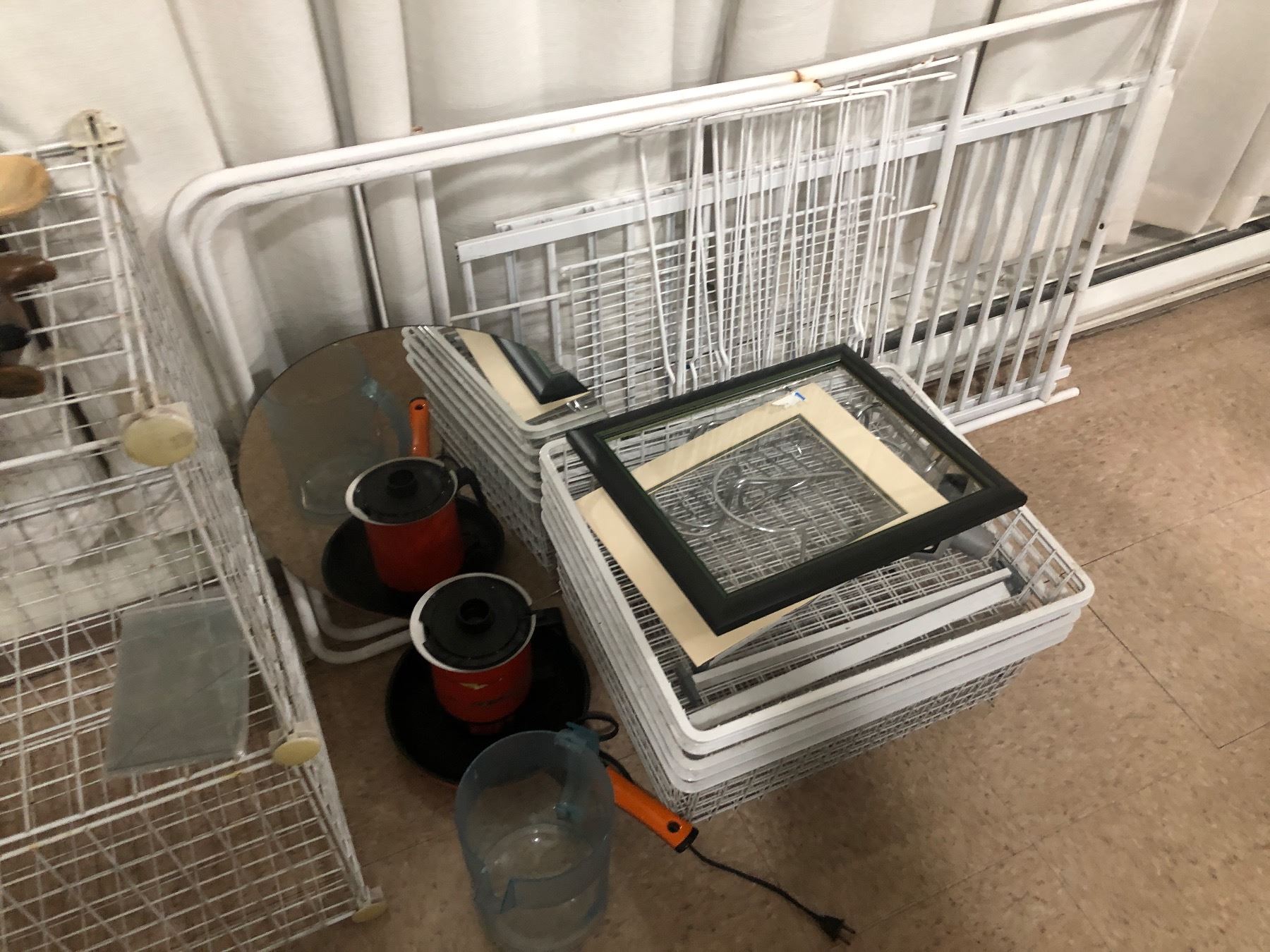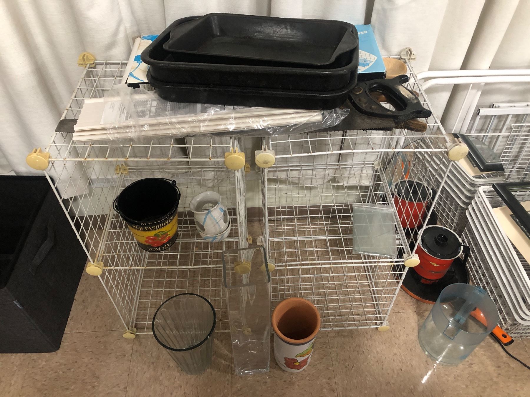 Group lot -  roasting pans/ wire cube storage/ wire baskets/ kettle & misc. vases/ 2 wood saws